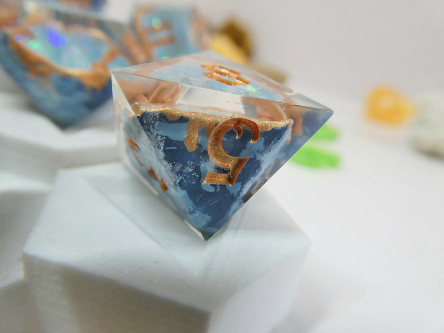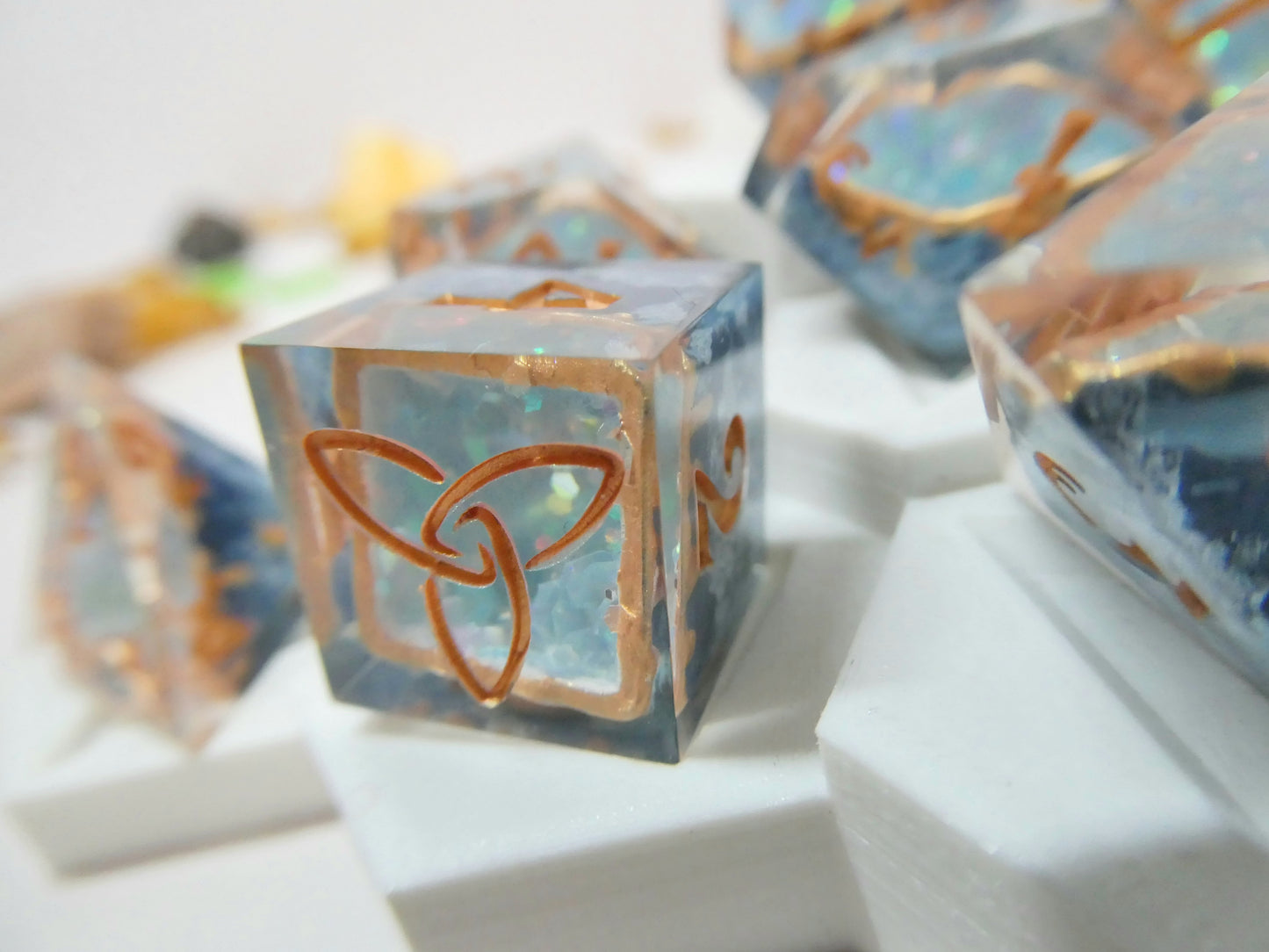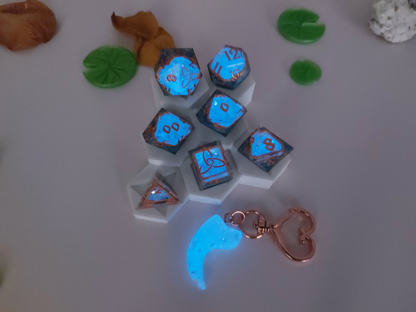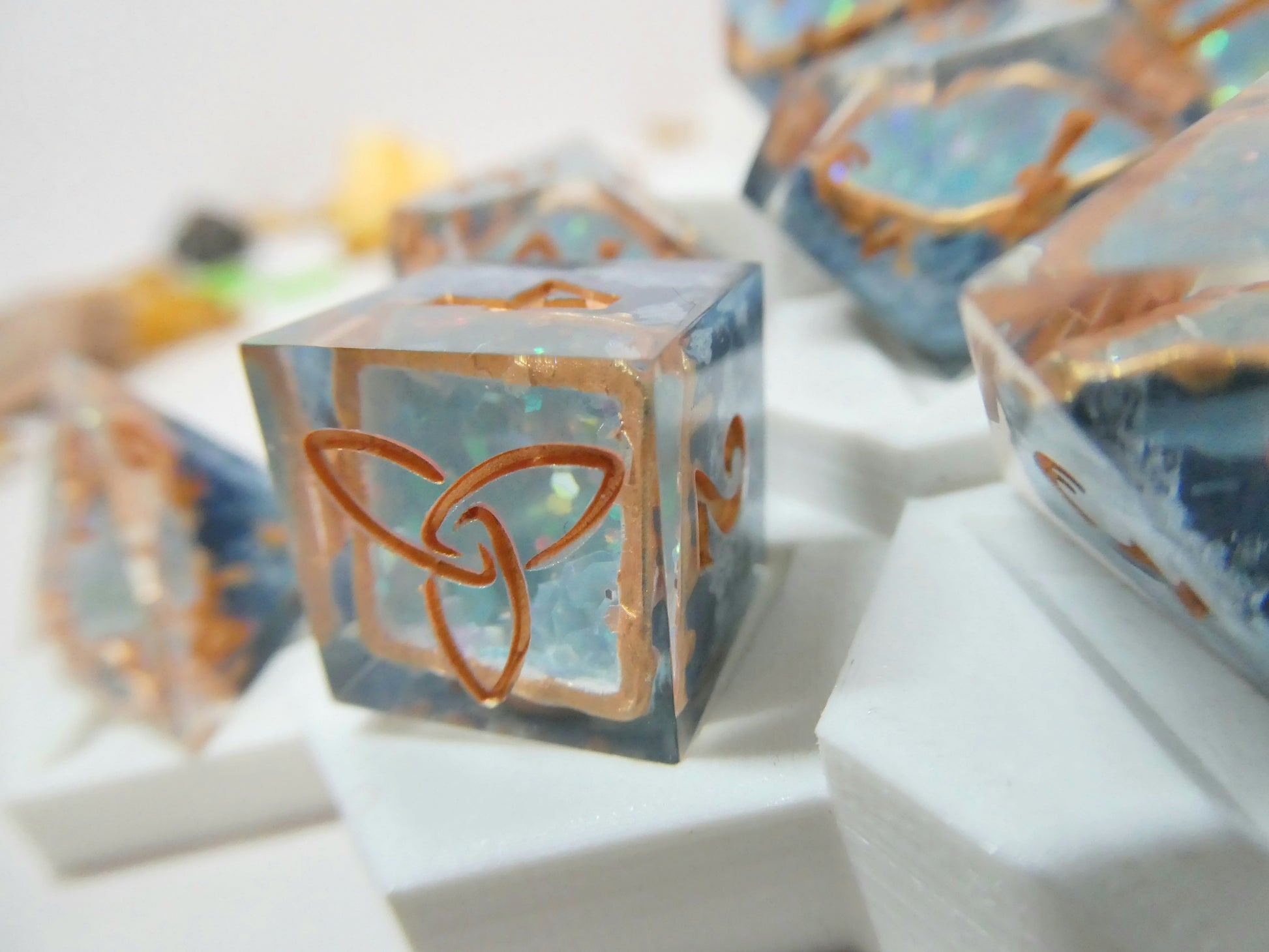 Aberrant Agate is made with geode blanks that have glow in the dark iridescent blue glitter on the insides of them. The outside of the shells have been painted in various tones of blue with a bronze around the open edges. The set itself is inked in the same bronze paint.