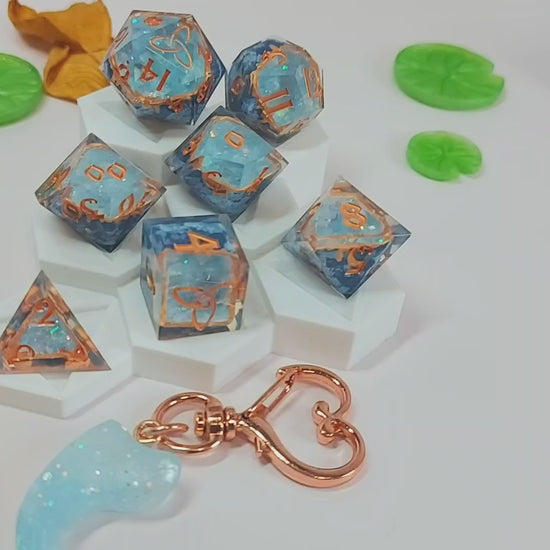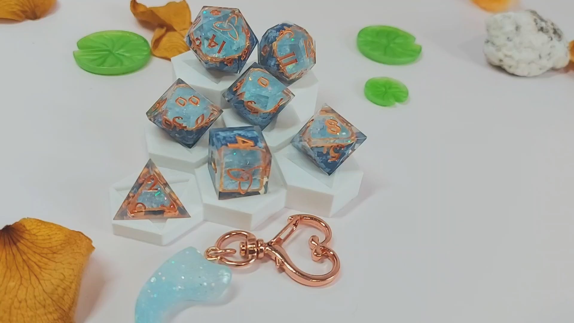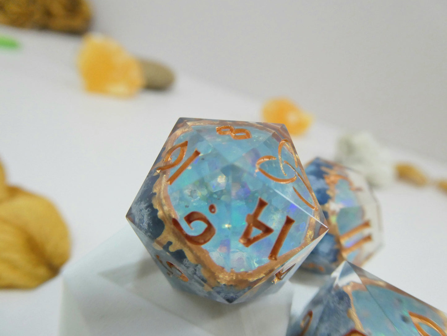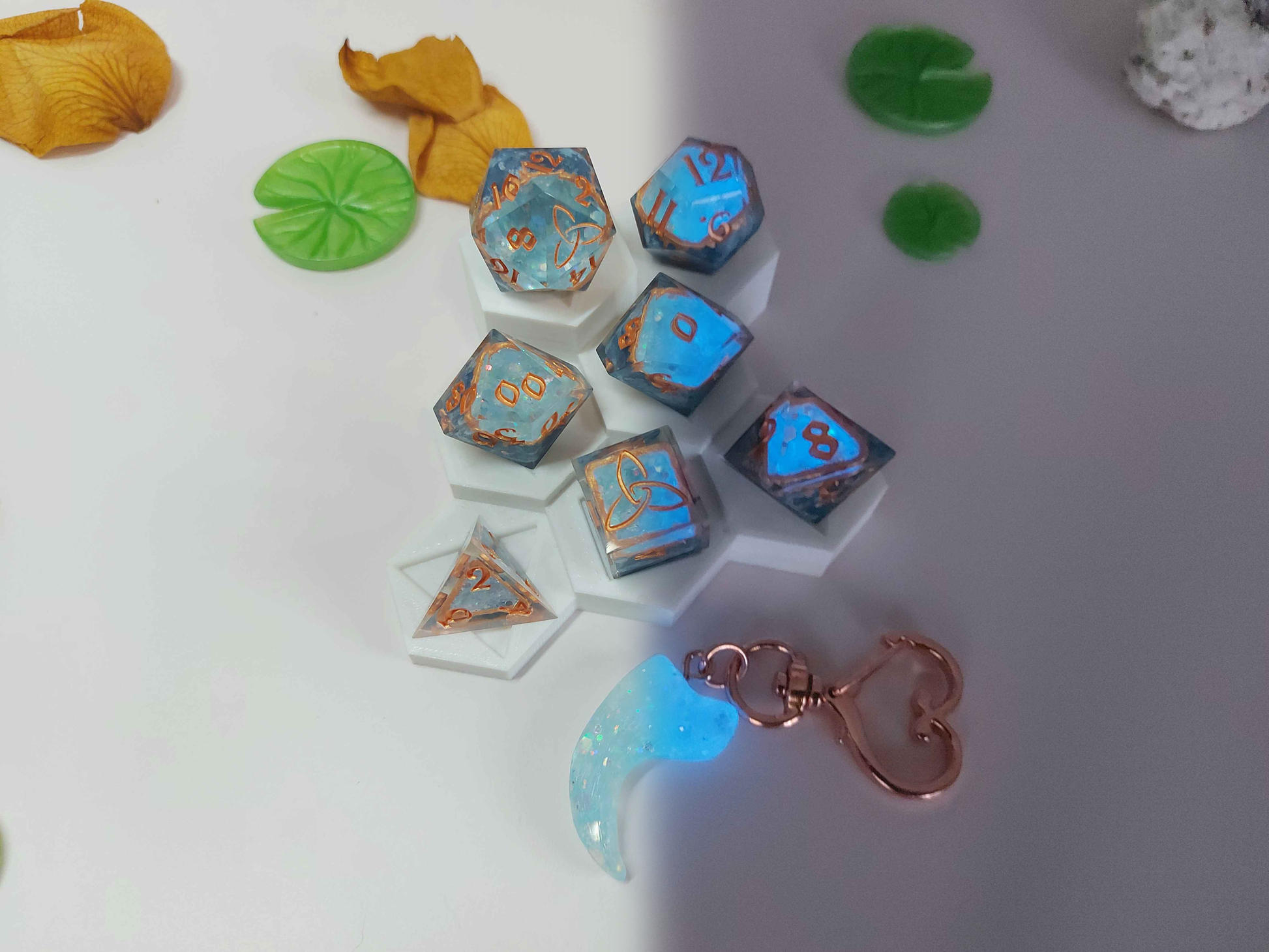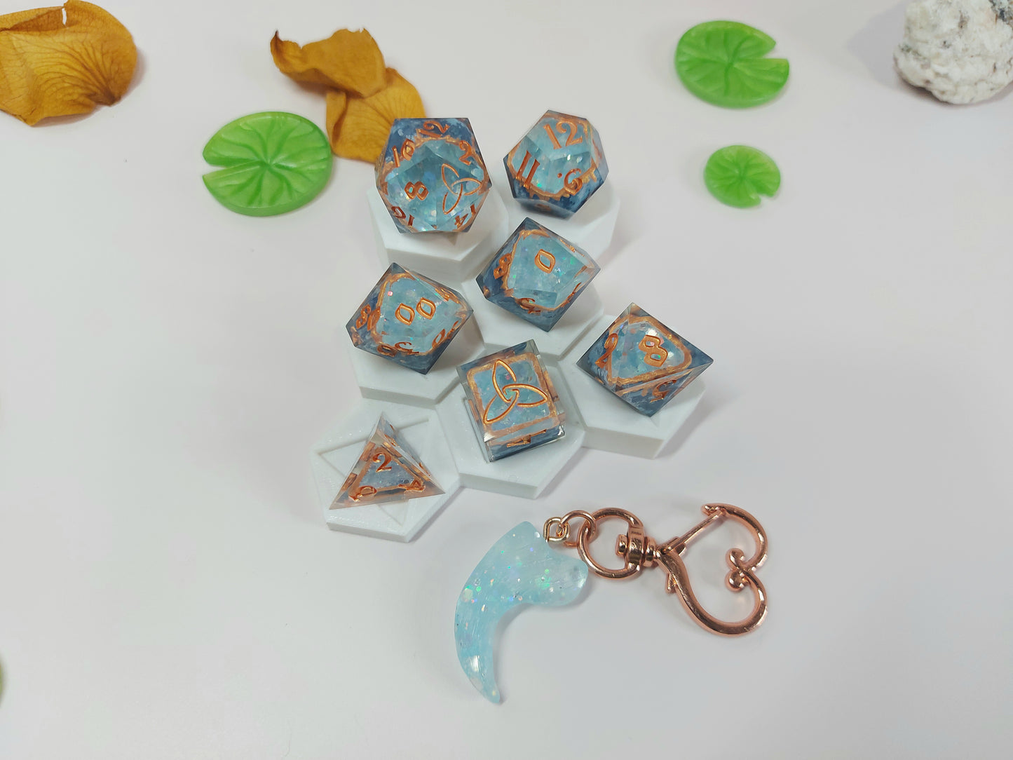 Aberrant Agate is made with geode blanks that have glow in the dark iridescent blue glitter on the insides of them. The outside of the shells have been painted in various tones of blue with a bronze around the open edges. The set itself is inked in the same bronze paint.