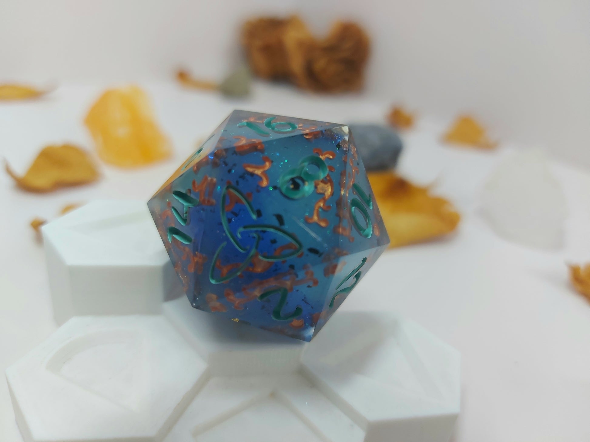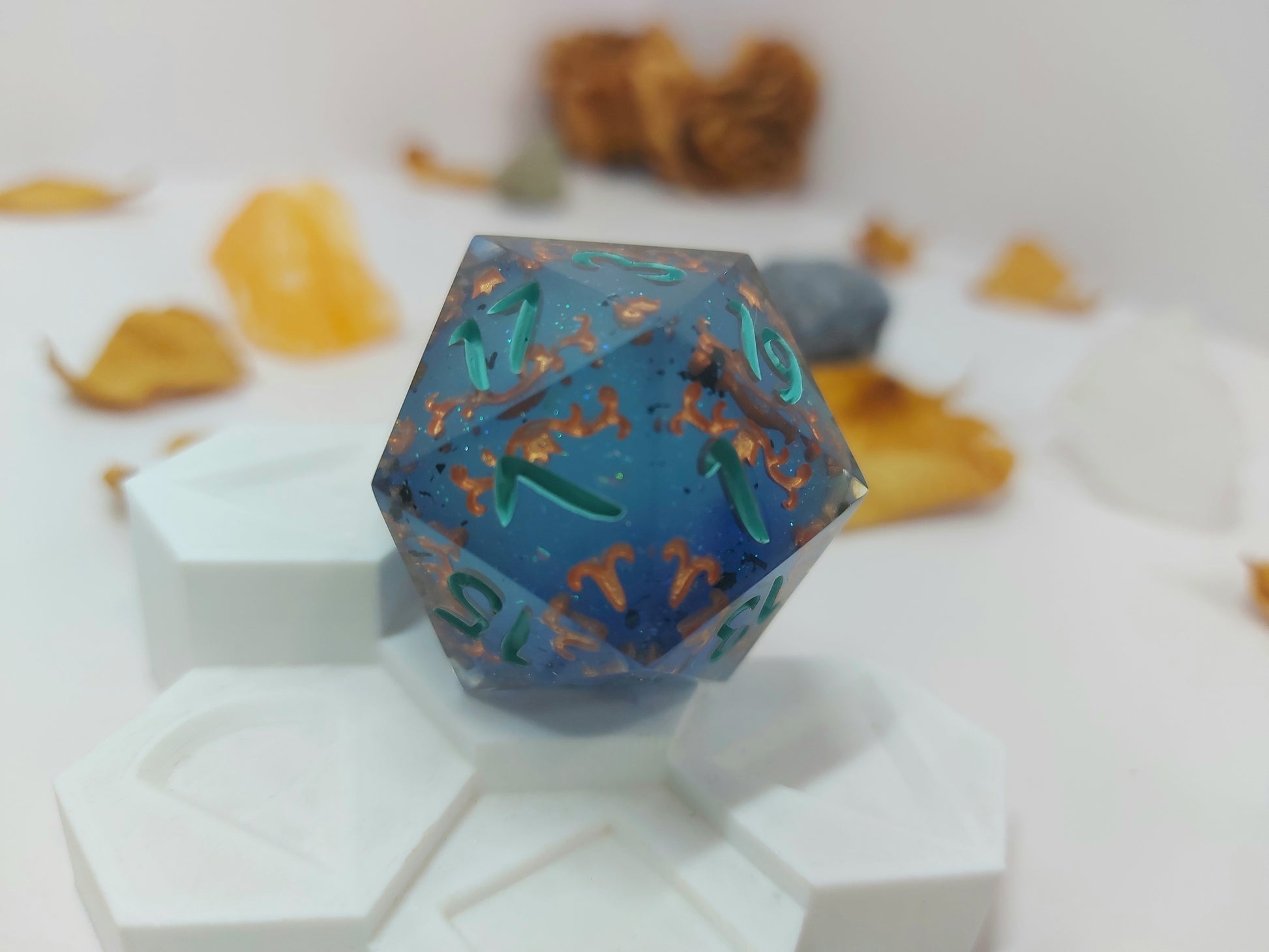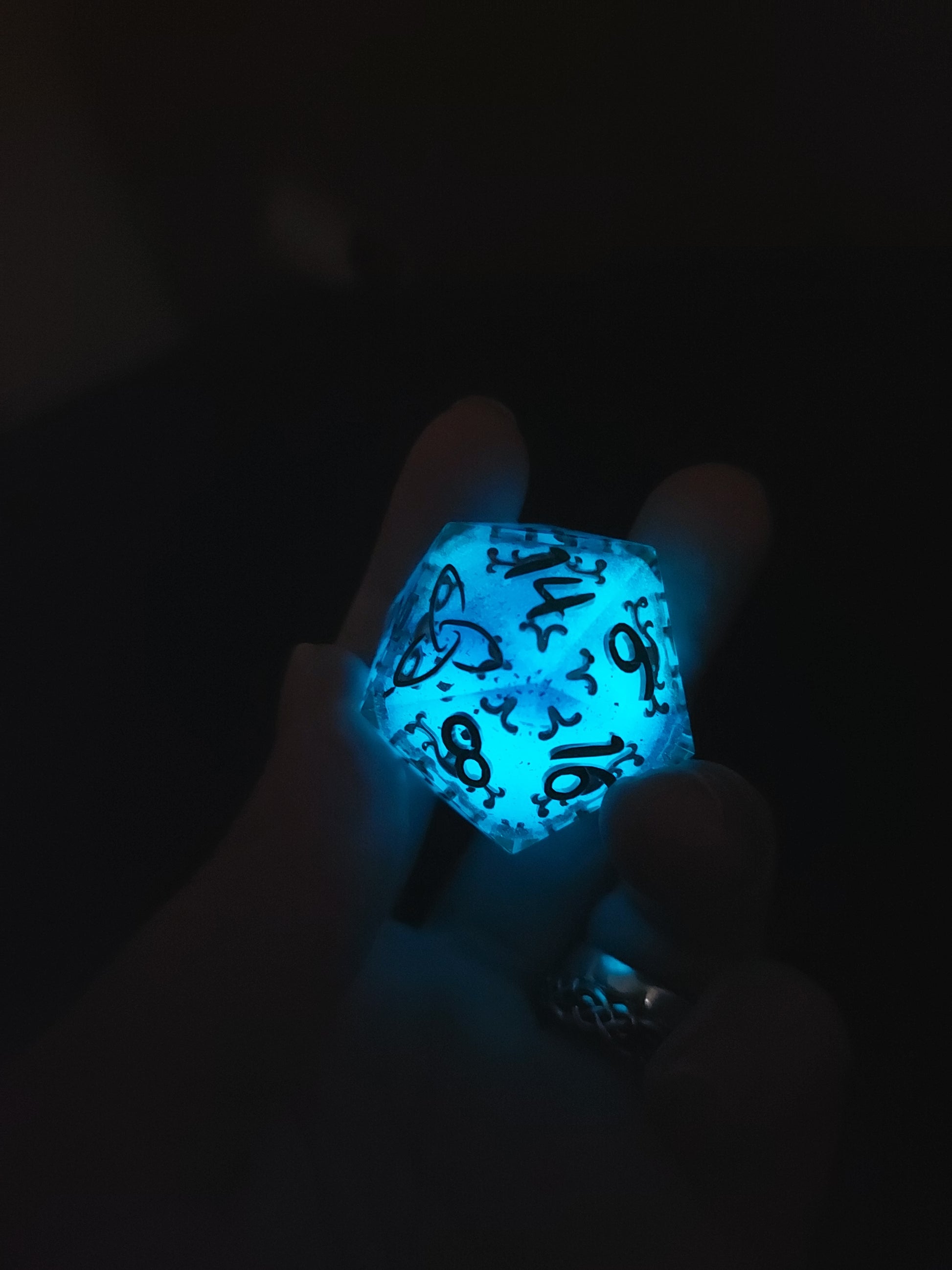 Bioluminance features swirling light and dark blues with various holographic foils and glitters. The art nouveau style engravings on the blank are inked in a vibrant bronze. The numbers are inked in a matte aqua. This design is filled with aqua glow-in-the-dark pigment that once charged is intense in even dim lighting.