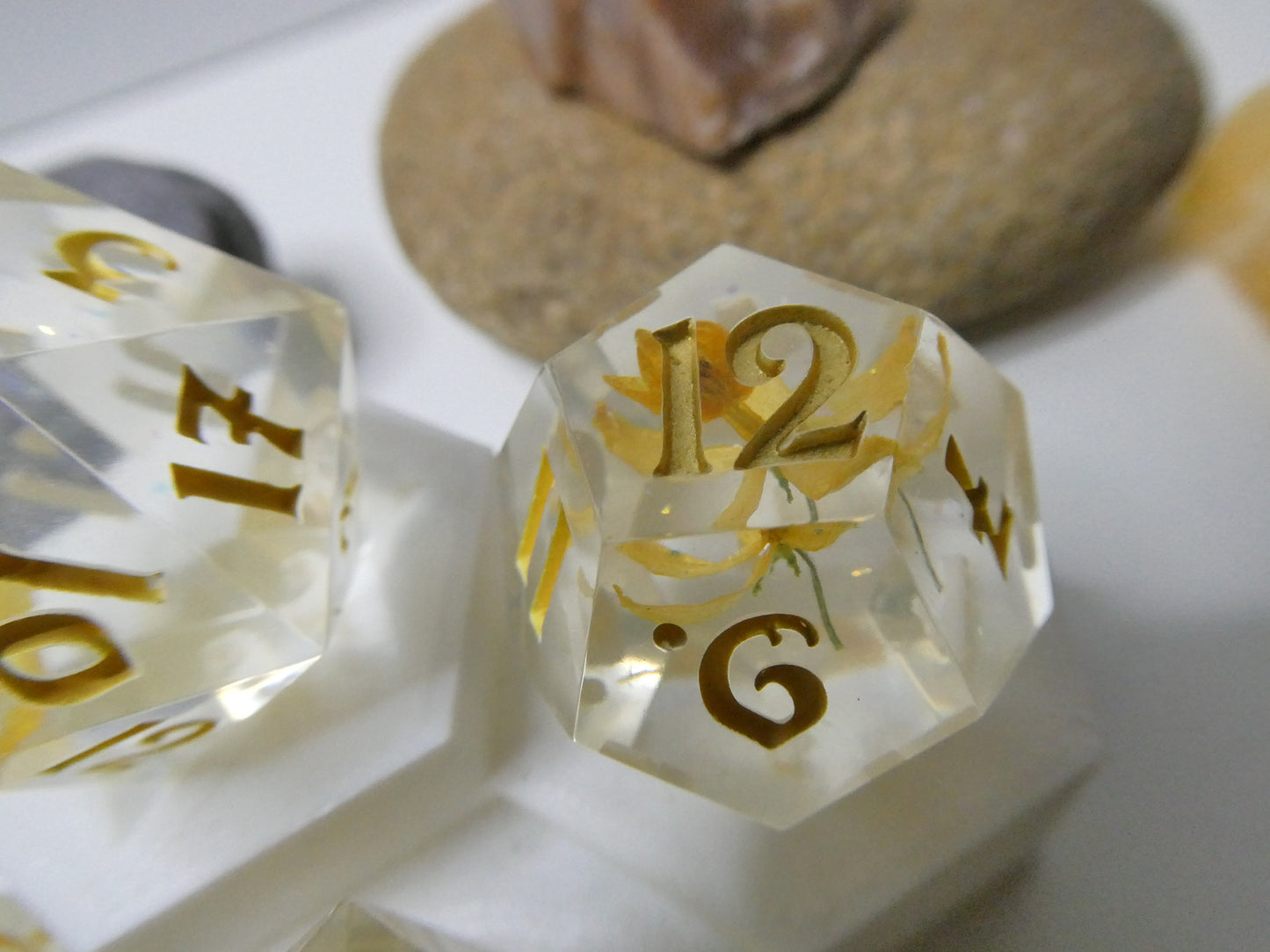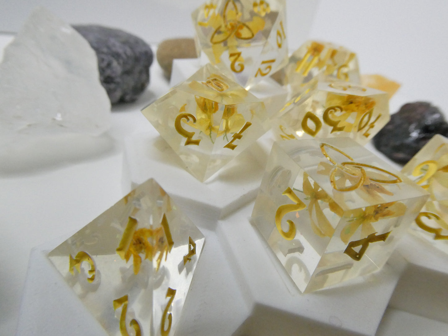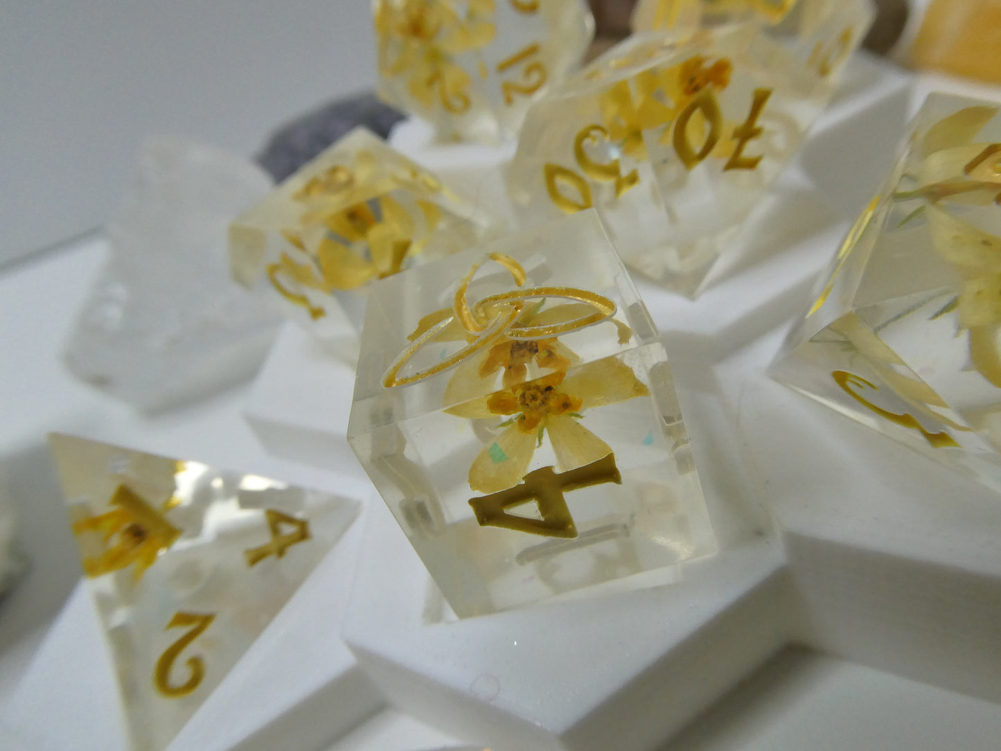 Butterfly Milkweed is made with personally collected and dried butterfly milkweed blooms preserved in transparent resin with a soft shimmer. It is under inked with a matte white to preserve the brightness of the set. The top color is a matte pastel yellow with a pale gold for the highest numbers.