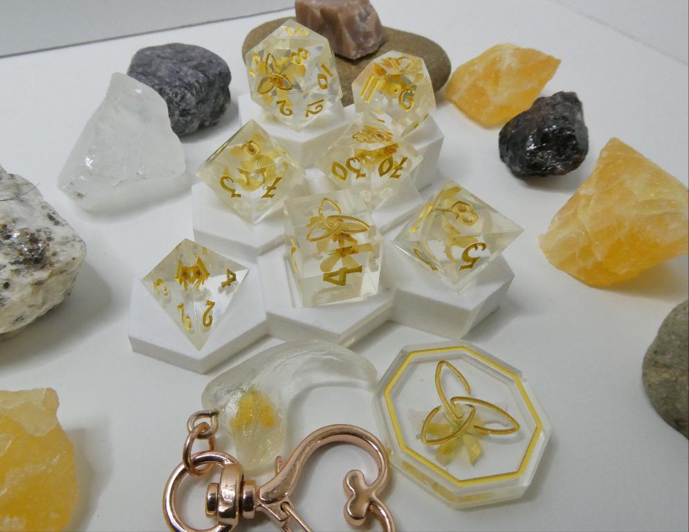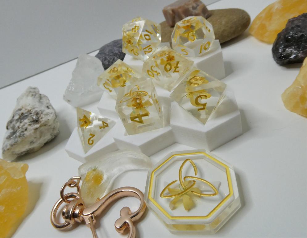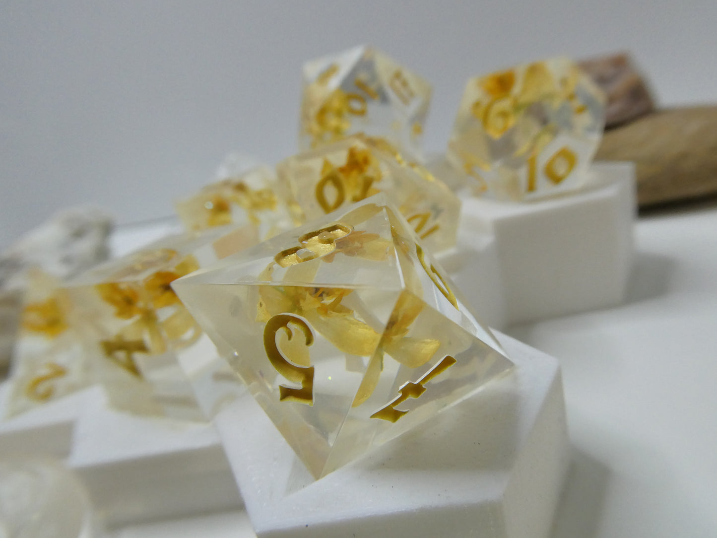 Butterfly Milkweed is made with personally collected and dried butterfly milkweed blooms preserved in transparent resin with a soft shimmer. It is under inked with a matte white to preserve the brightness of the set. The top color is a matte pastel yellow with a pale gold for the highest numbers.