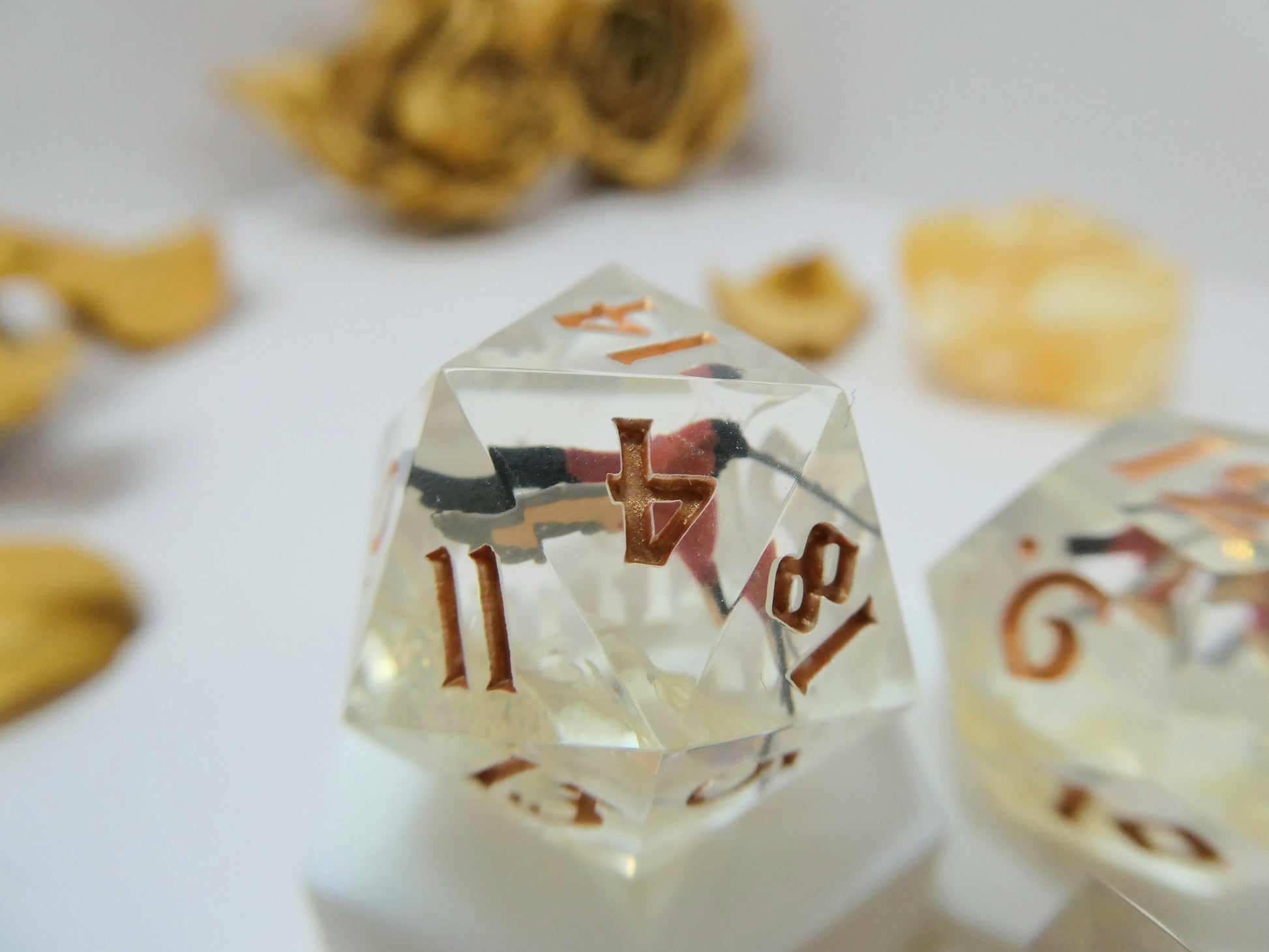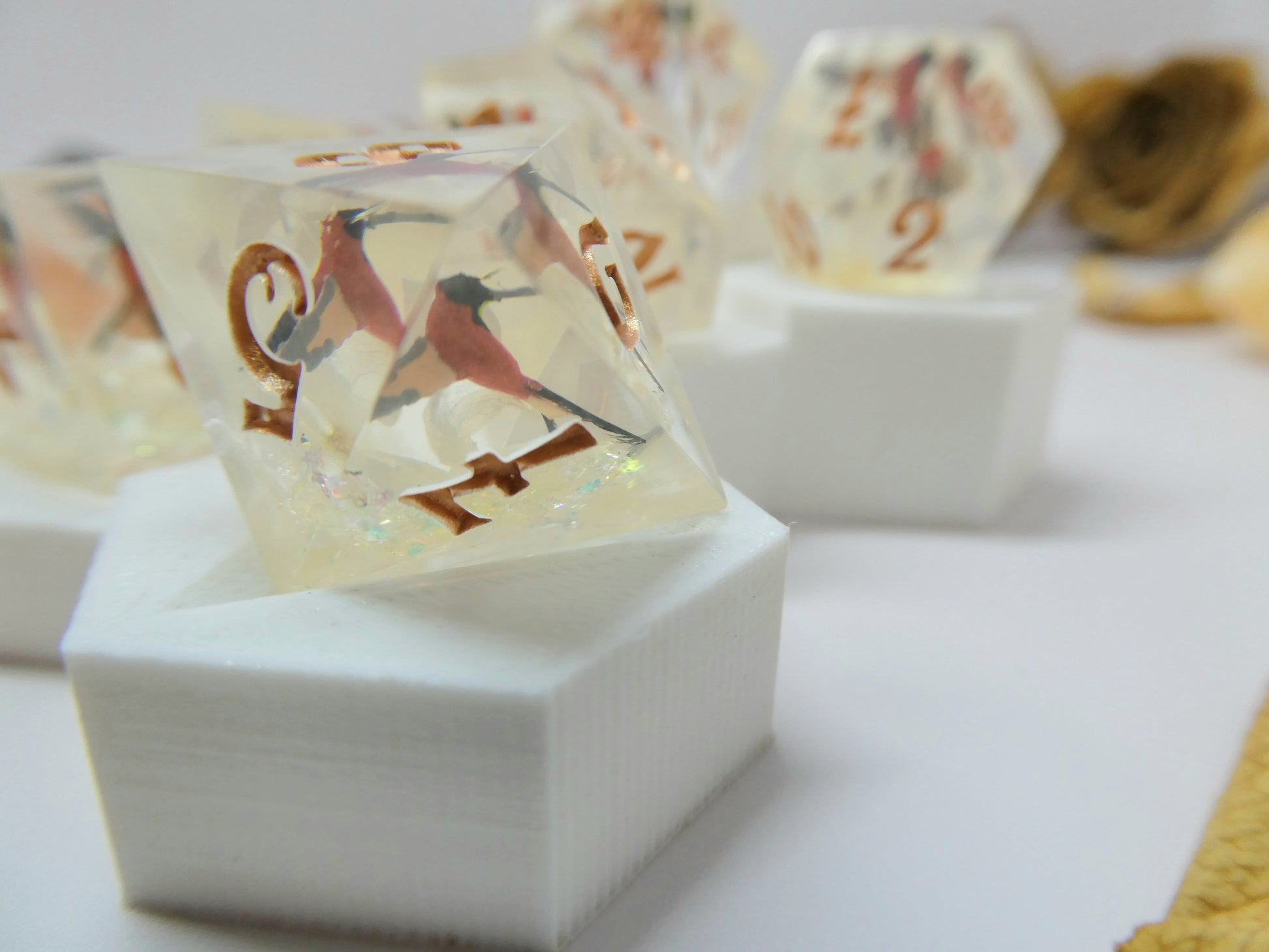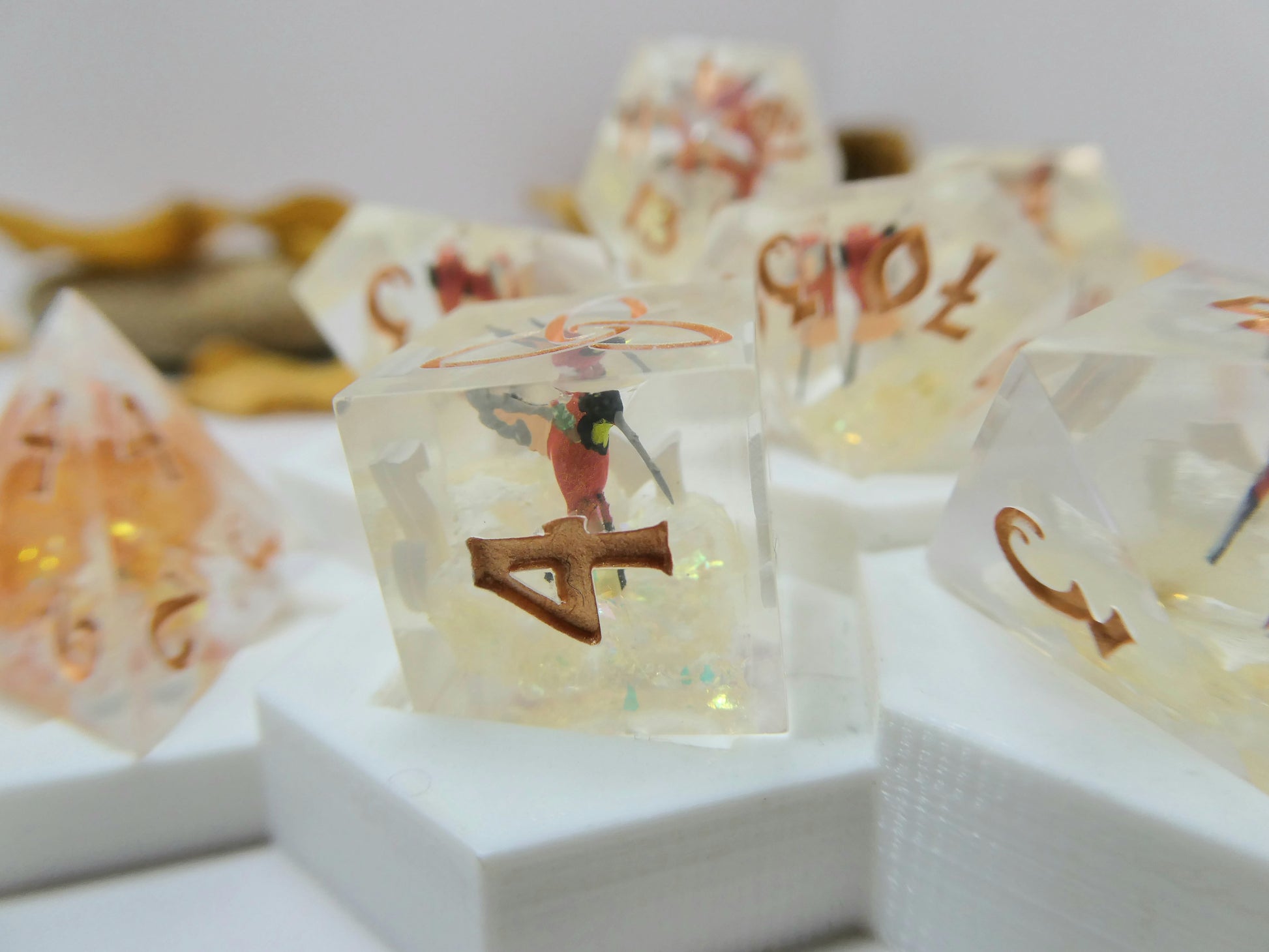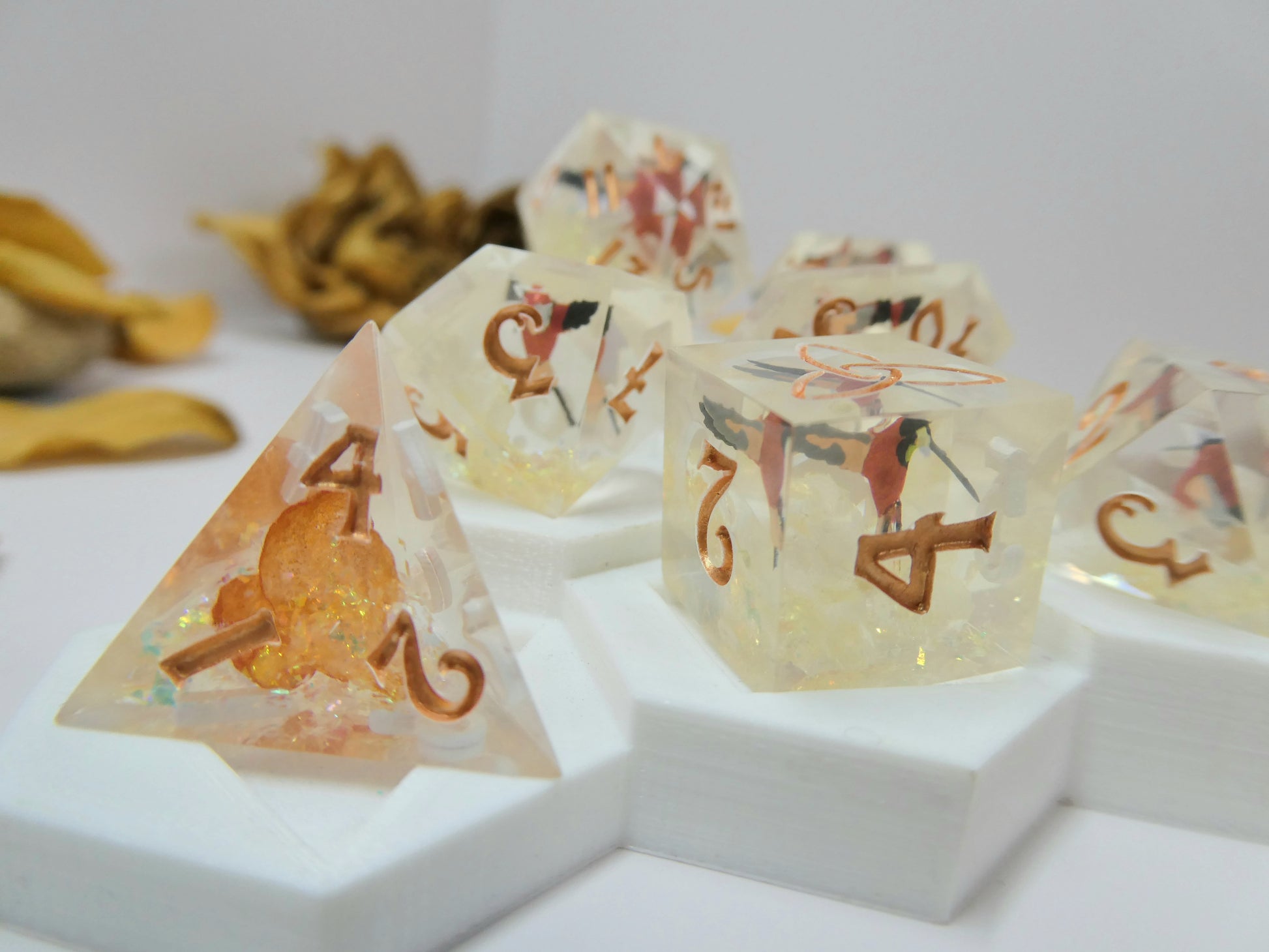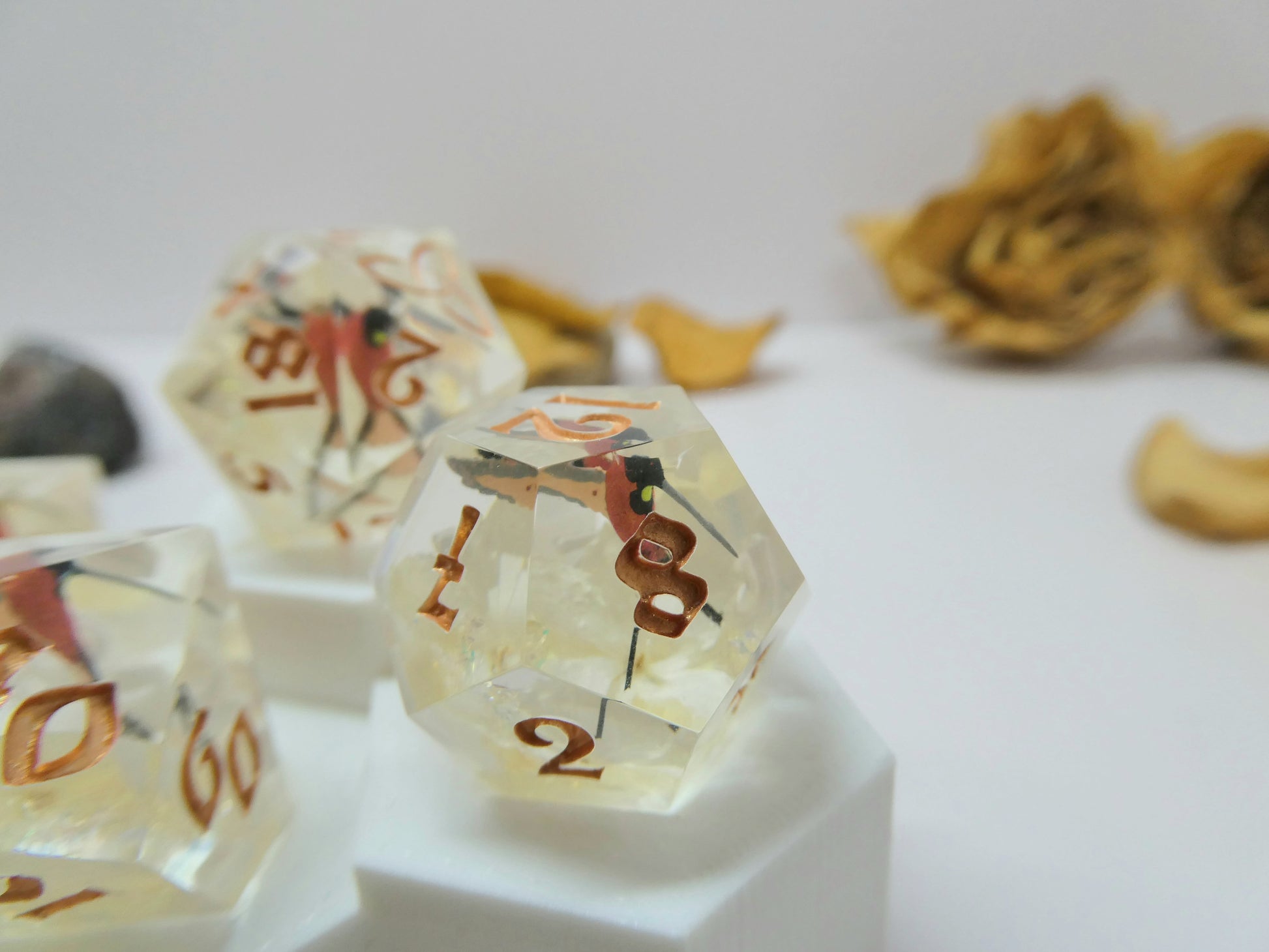 Crimson Topaz features miniature resin hummingbirds that have been hand-painted to mimic the natural coloration of ones found in the wild. They are positioned to appear flying above full hydrangea blossoms cradled amongst iridescent flakes. The set is inked in a bright bronze.