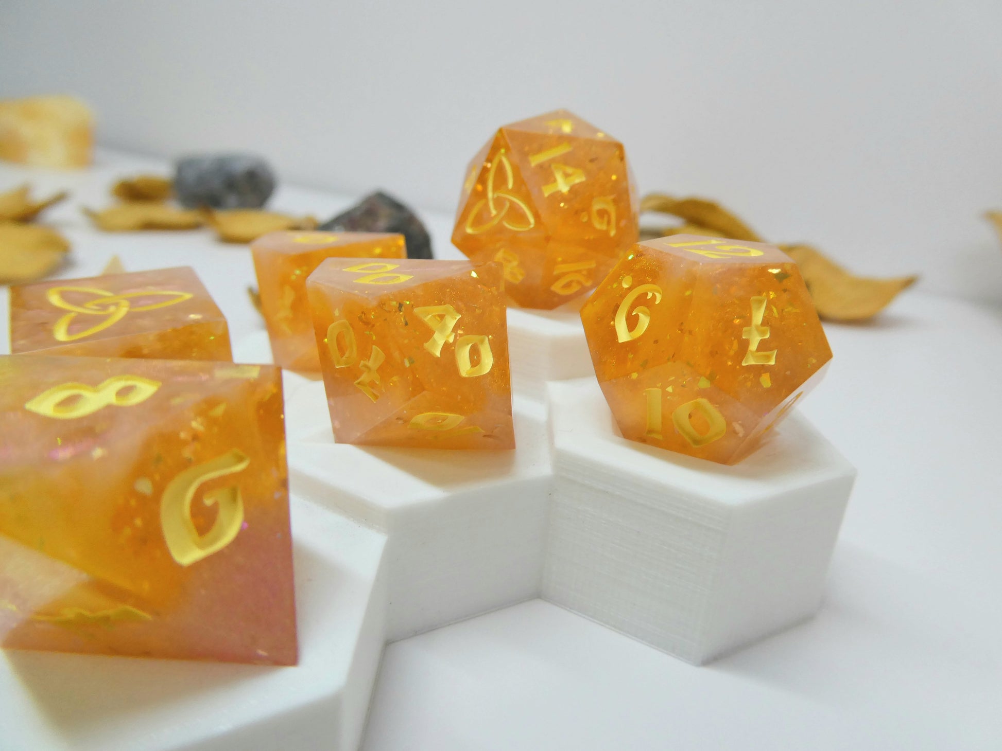 Glimmering light features transparent yellow resin filled with iridescent flakes and sinking strands of a pale pink mica pigment. It is inked in a sunny matte yellow.