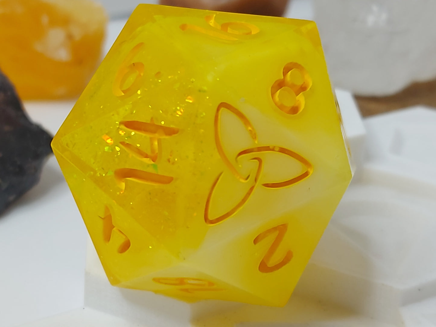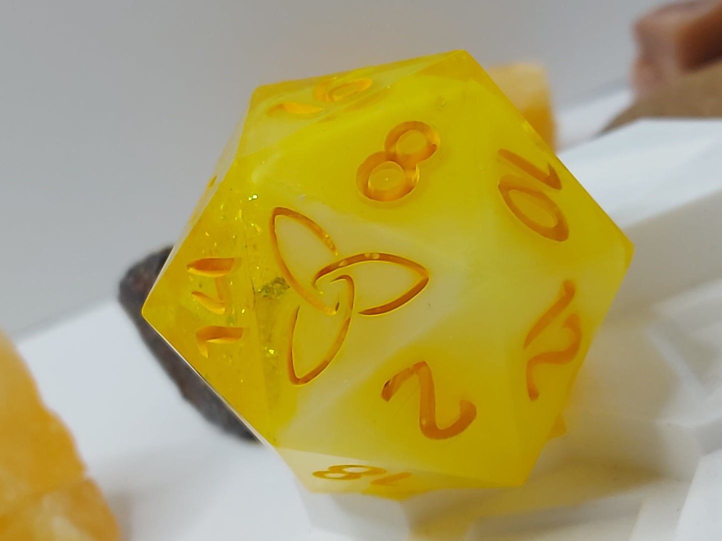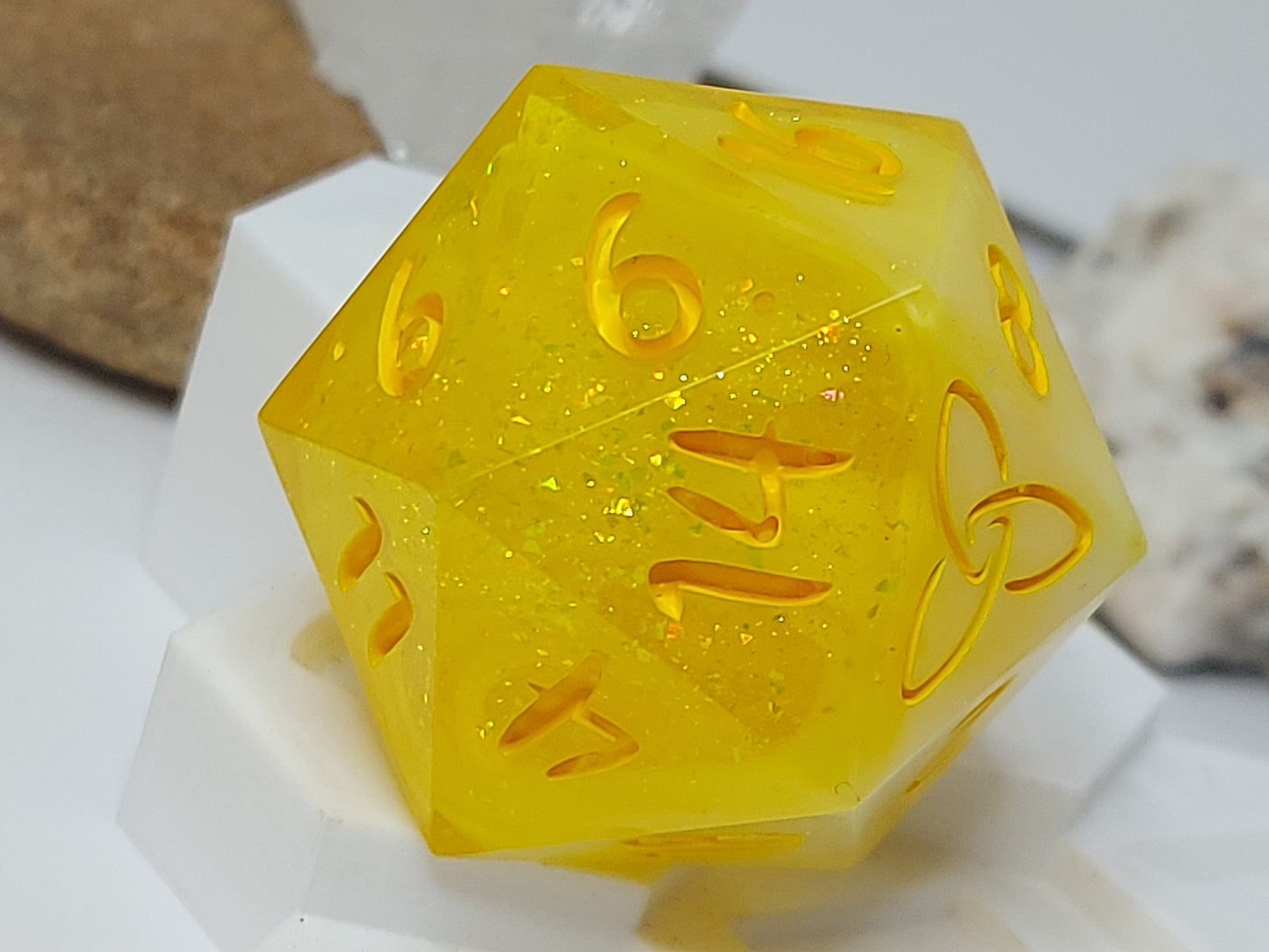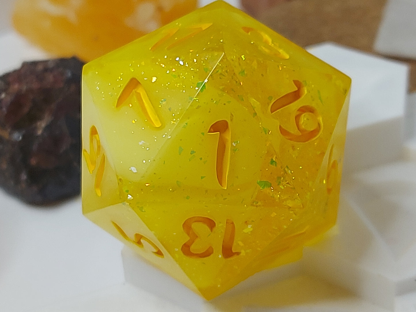 Lemon Sorbet is a brilliantly yellow set with clouds of milky pastel yellow and white. It has multiple glitters and iridescent flakes suspended in it's transparent yellow body. Inked in a bright yellow, this Oversized d20 is an eye-catcher with a deceptively edible appearance. (Please don't eat the dice, no matter how tempting!)