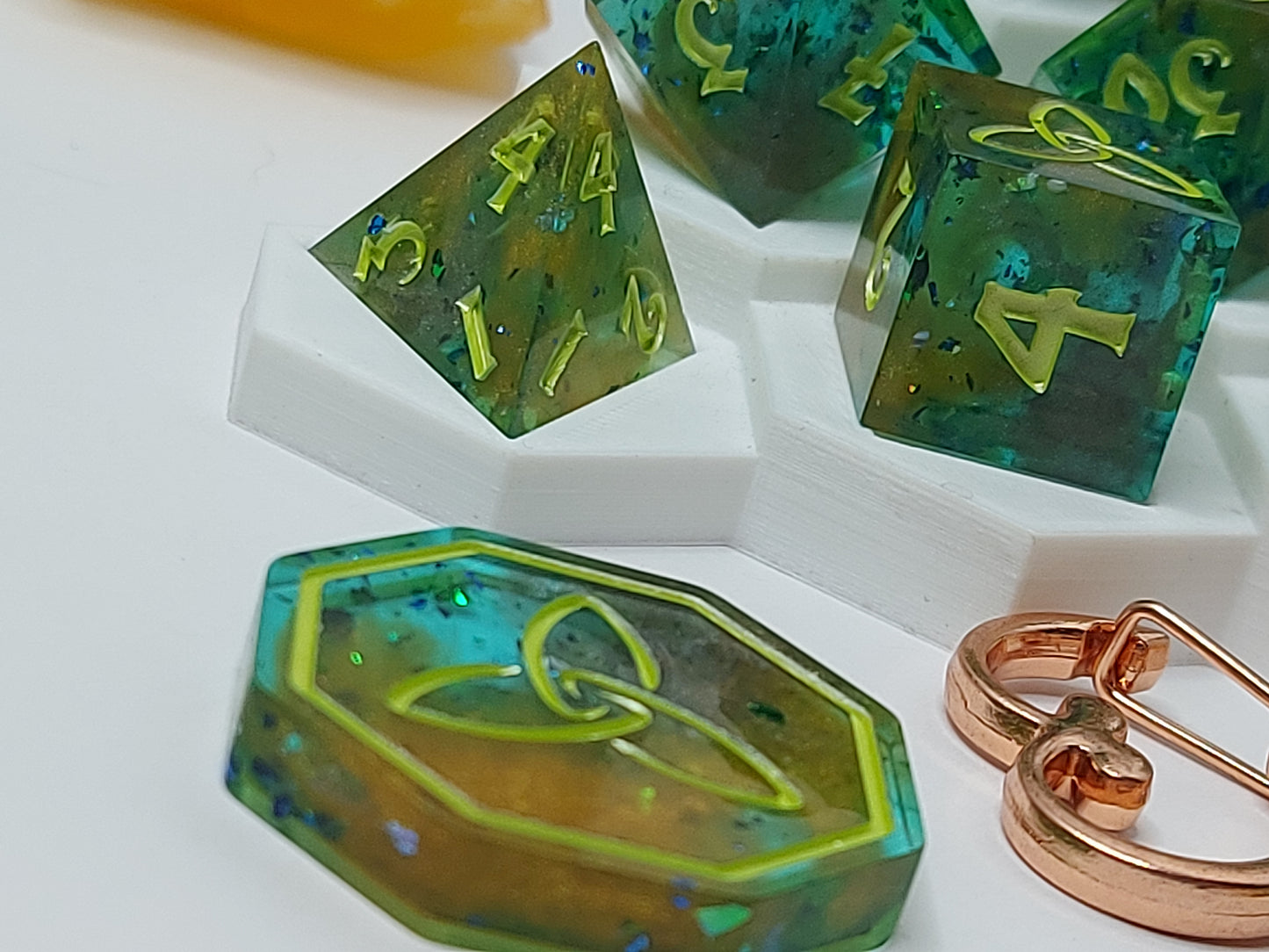 Lingering Tempest has a stormy blue with suspended holographic foil. There are swirls of gold and gunmetal waiting within, giving it the feel of a dark sky just after a storm has ended. It is inked in a pearlescent pastel green.