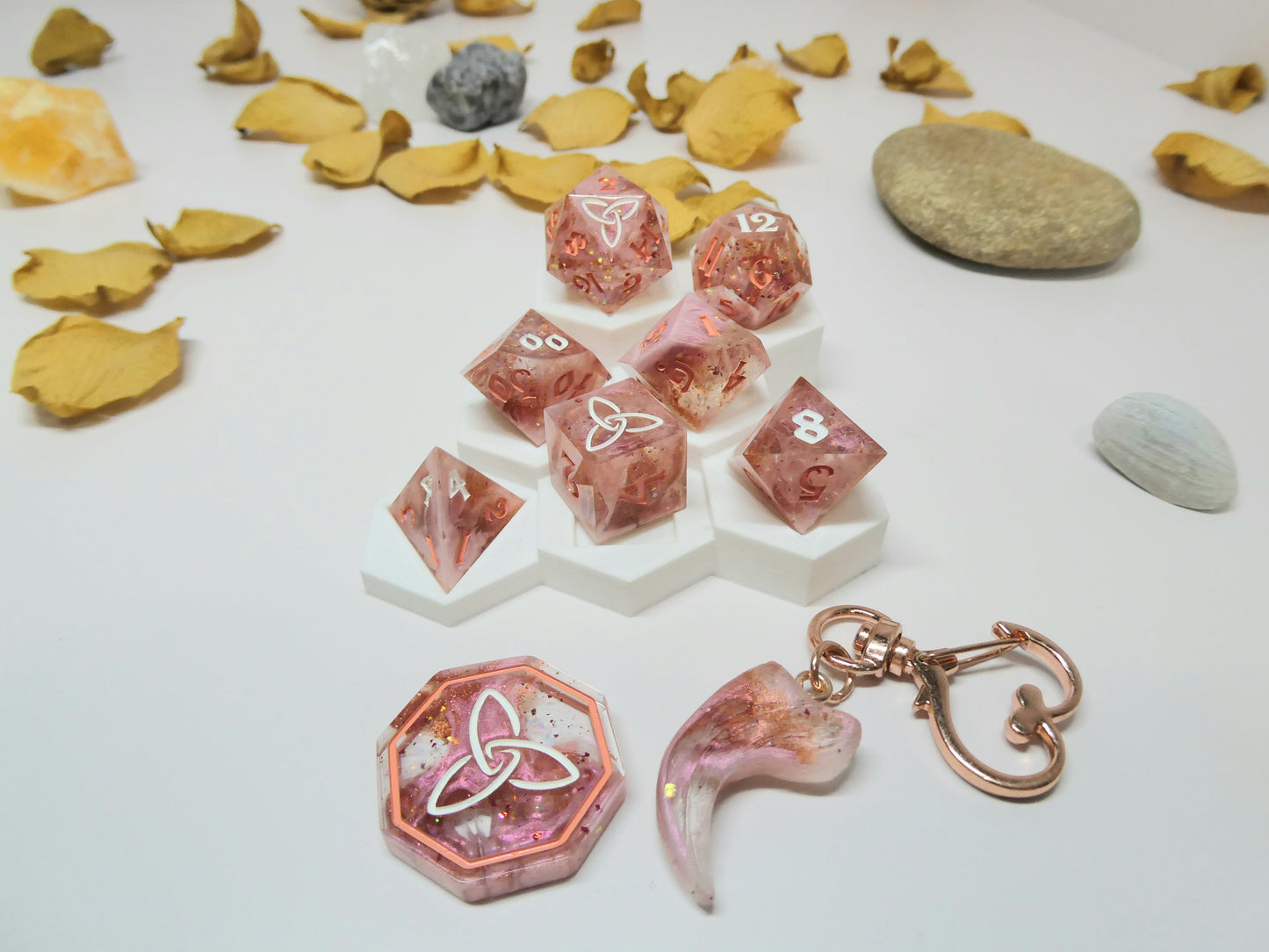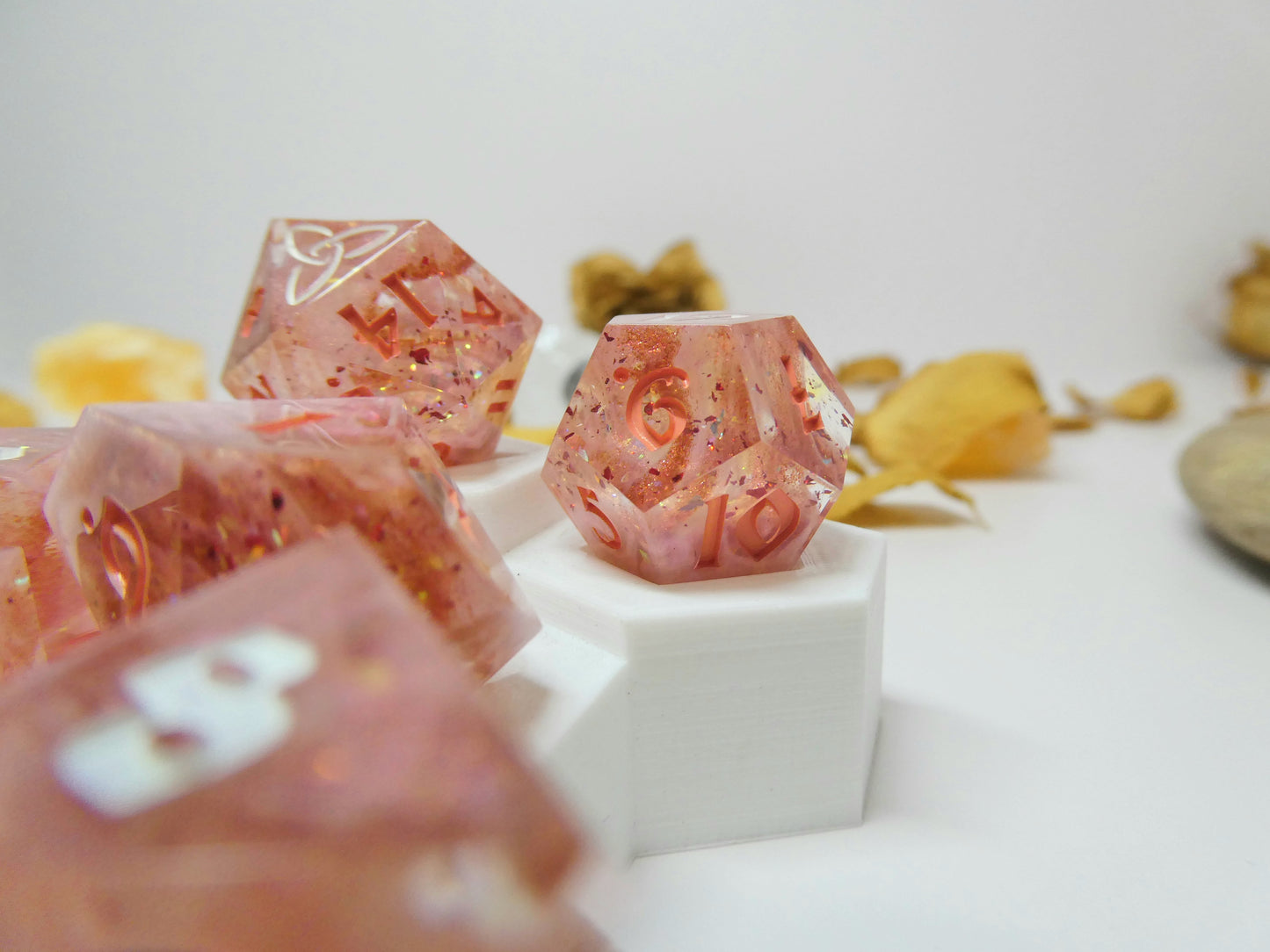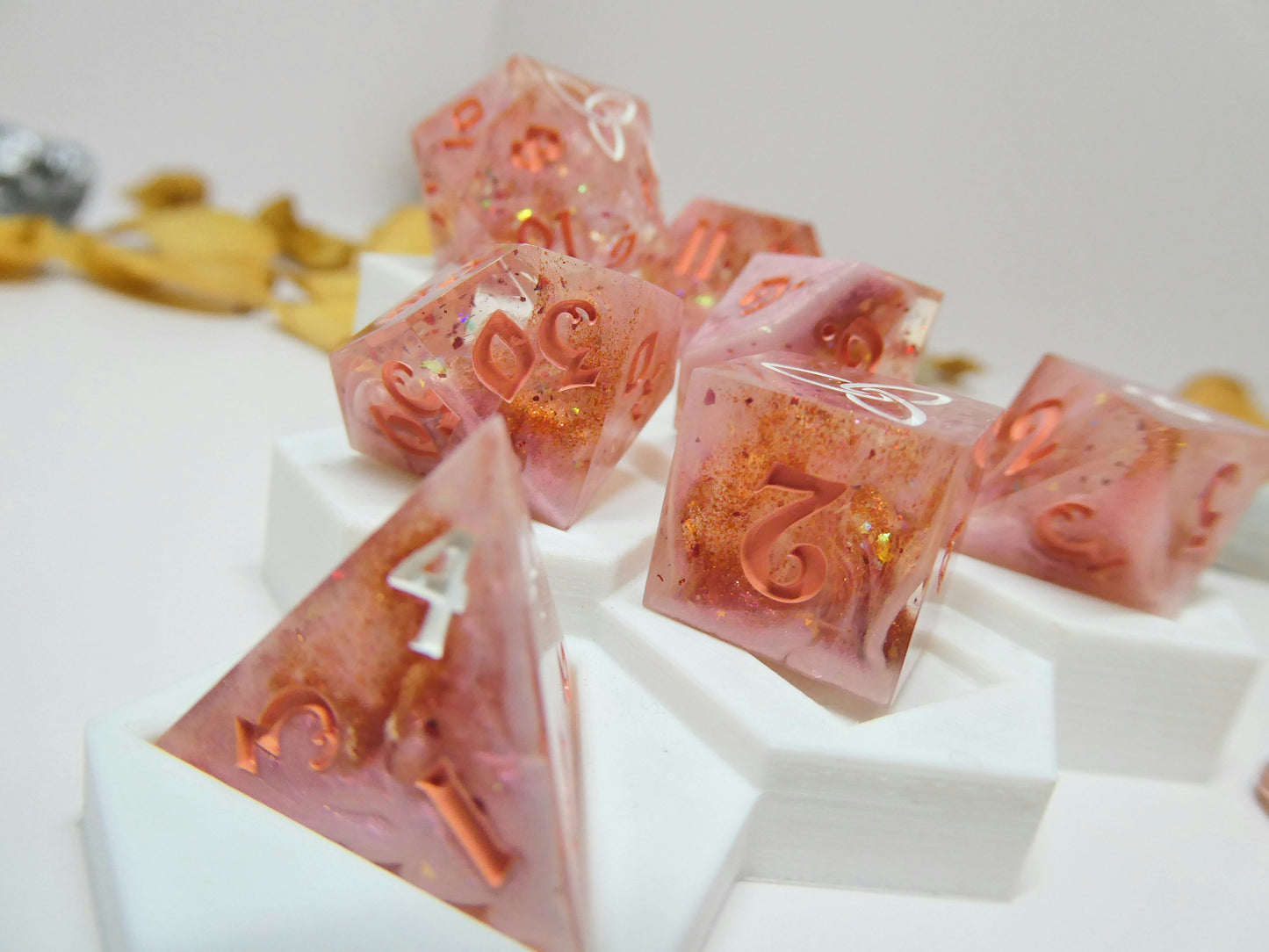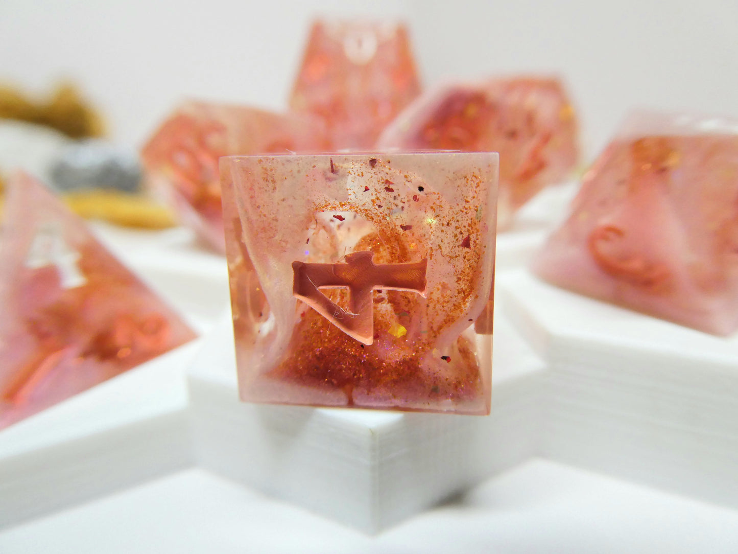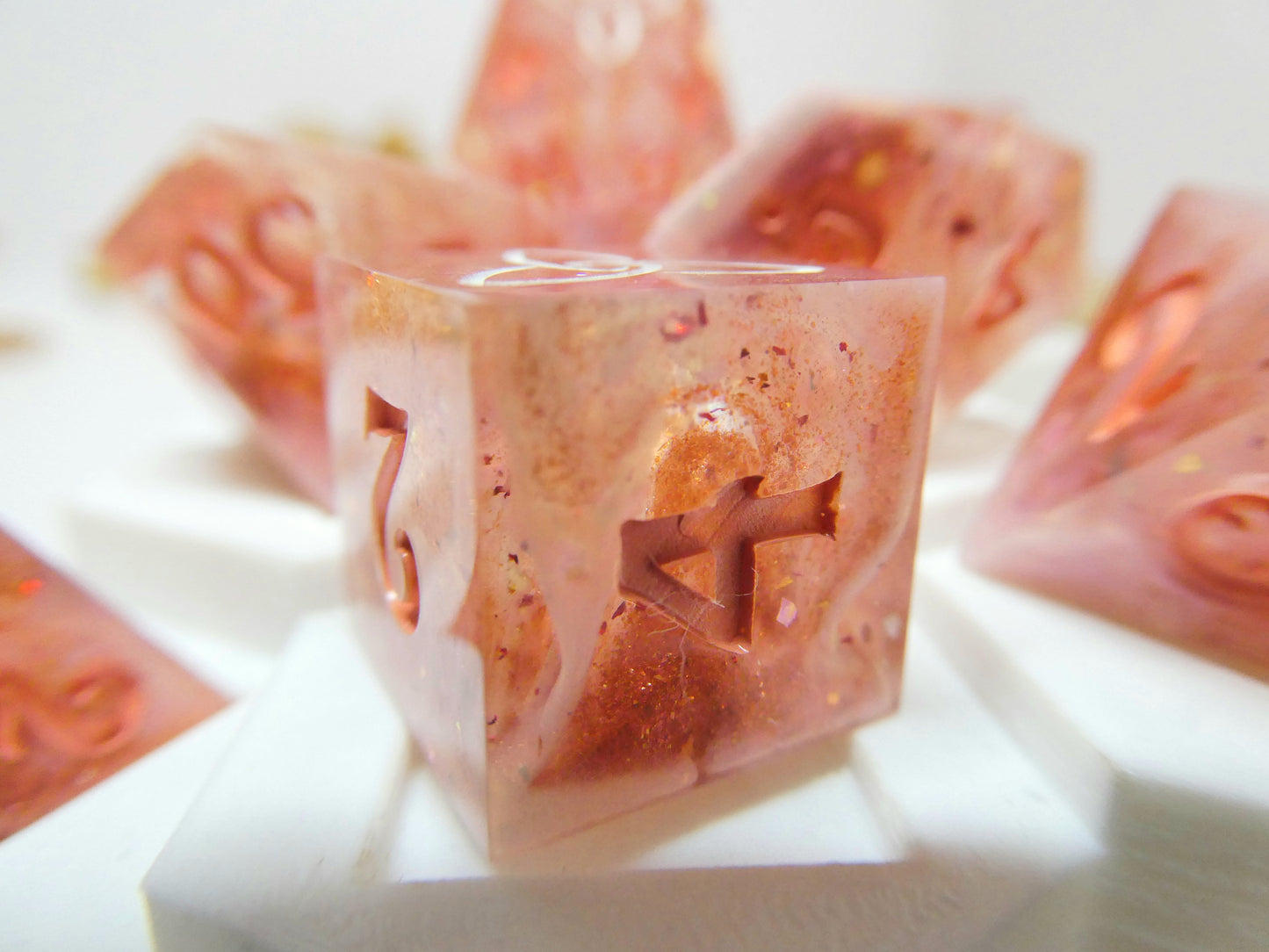 Lovestruck features clear resin with sinking swirls of pink and red, accented by flecks of red holographic glitter. The set is inked coral with white for the highest faces.