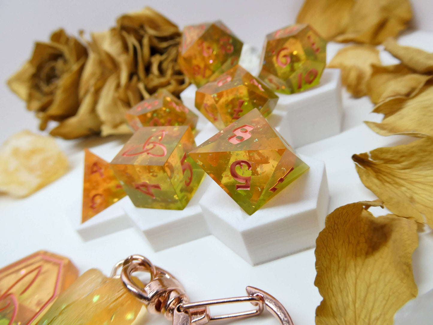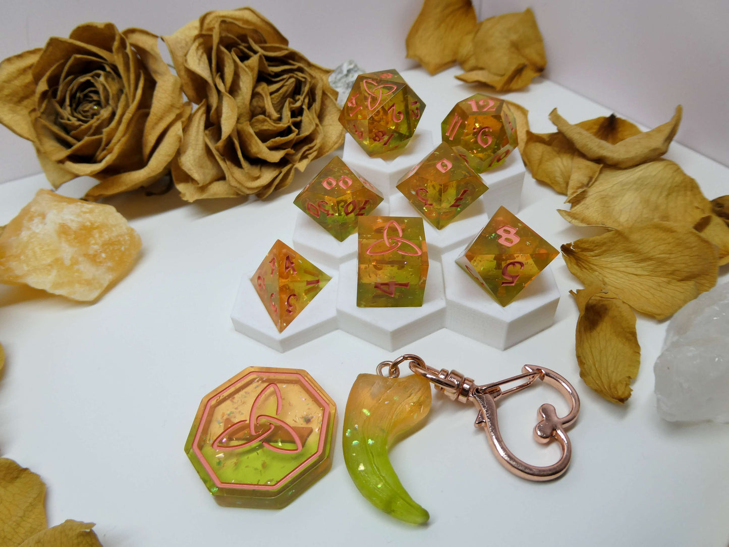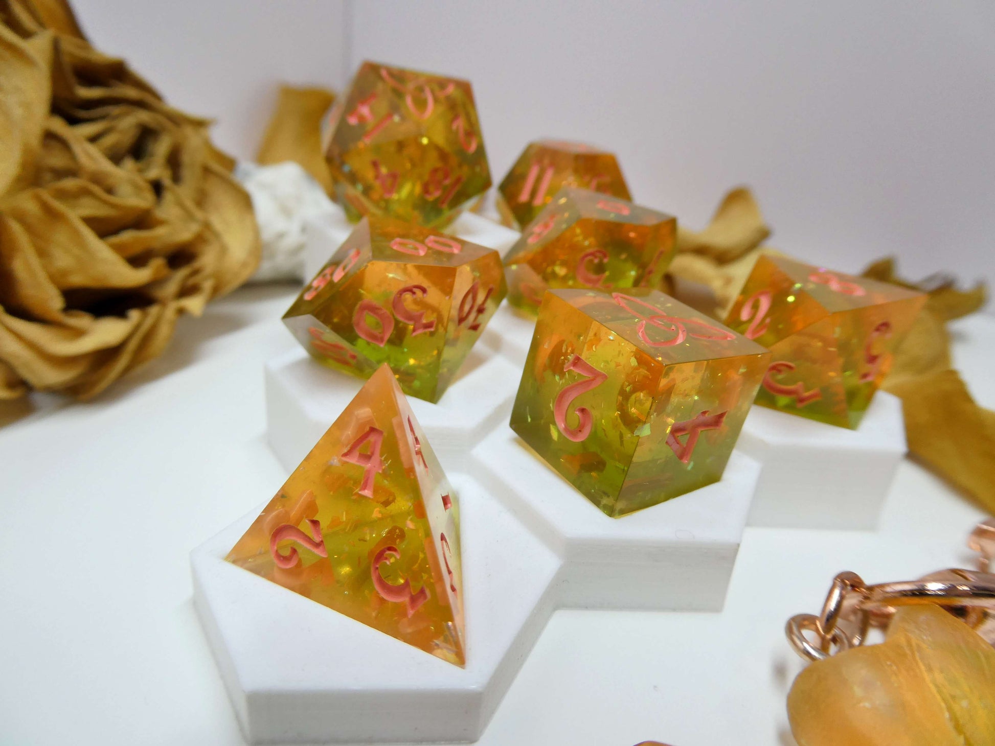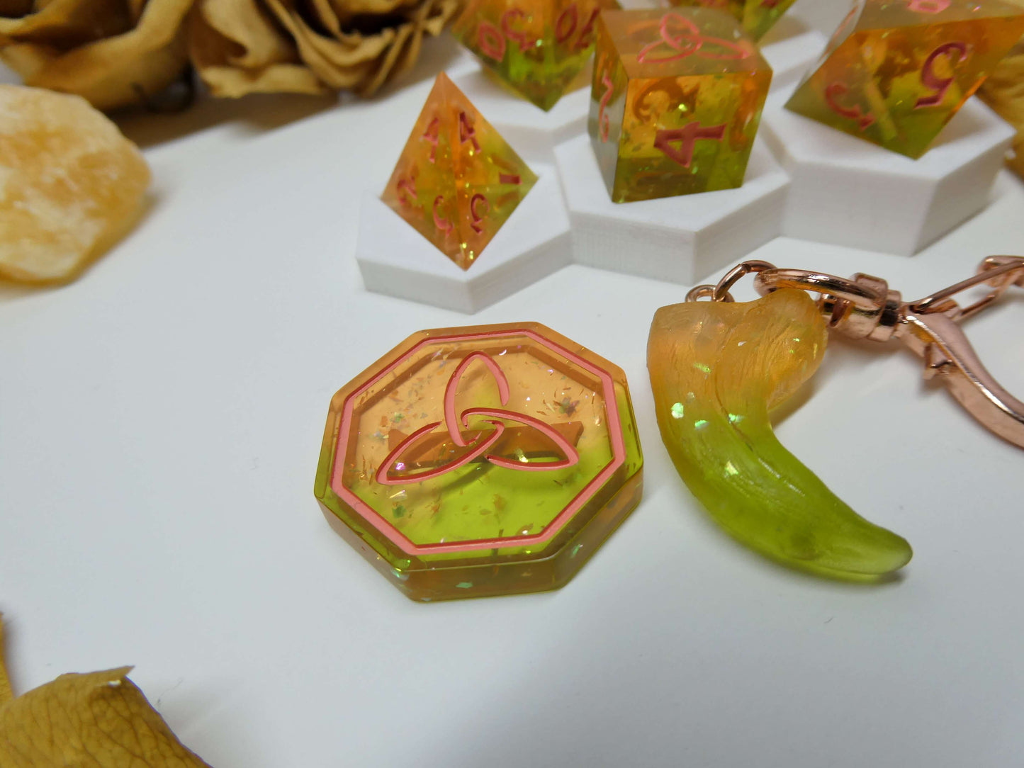 Peach Green Tea is a soft blend of peach and green resin with plenty of glitter and iridescent flakes to catch the light. The set is inked in a coral color to compliment the overall theme.