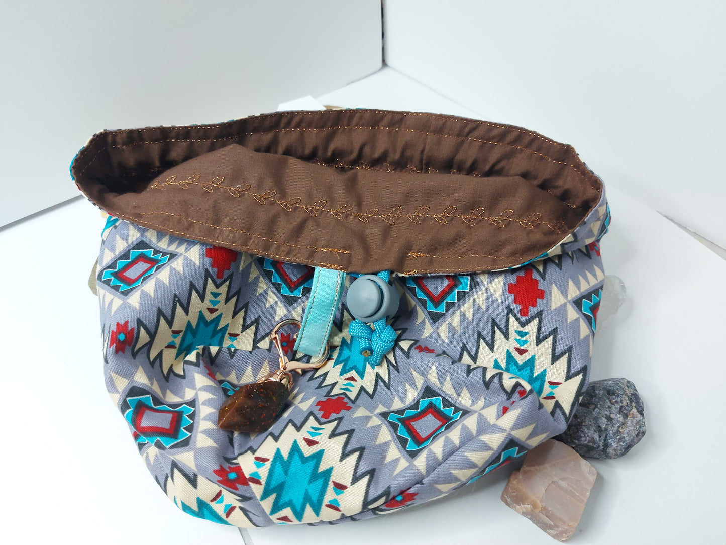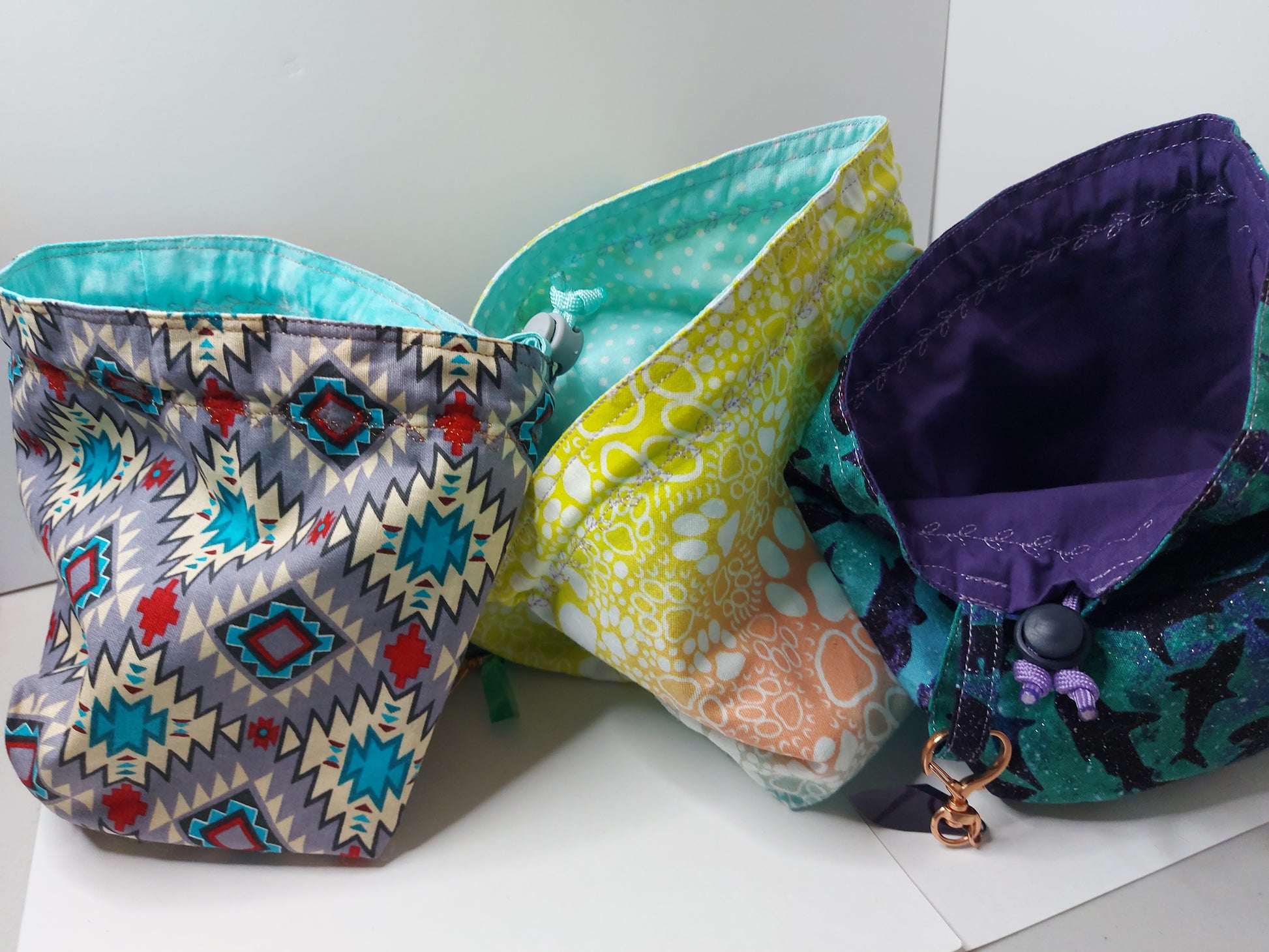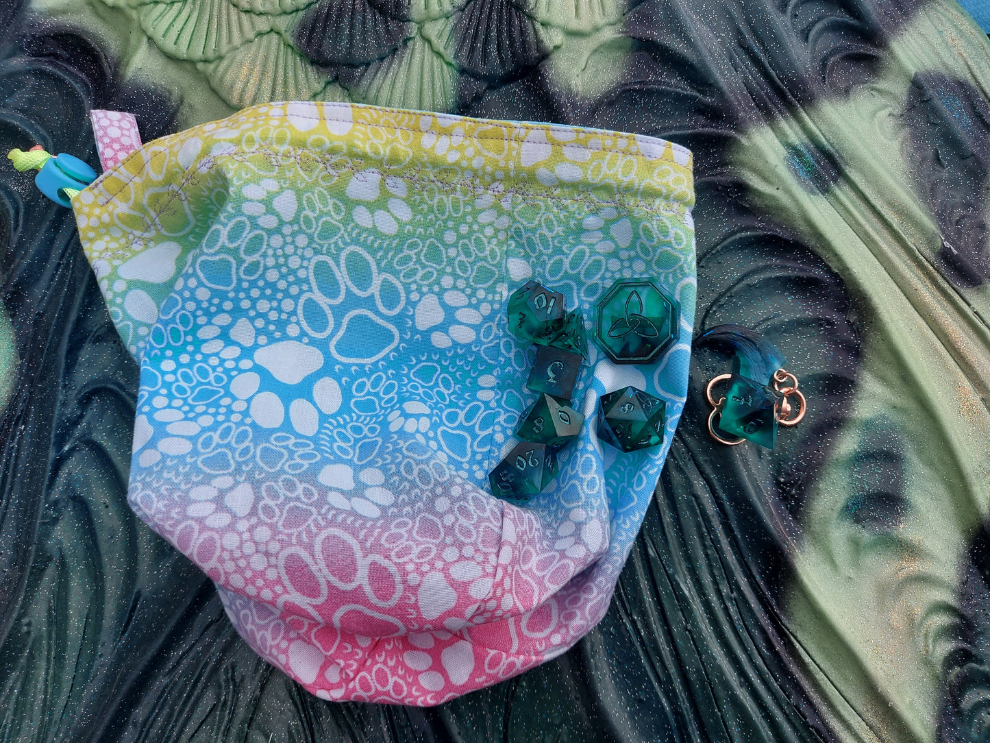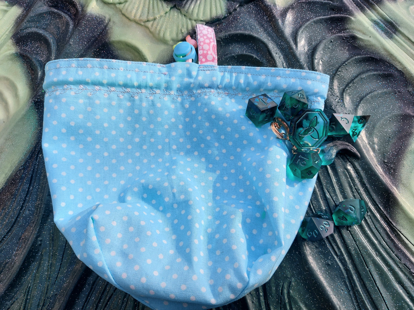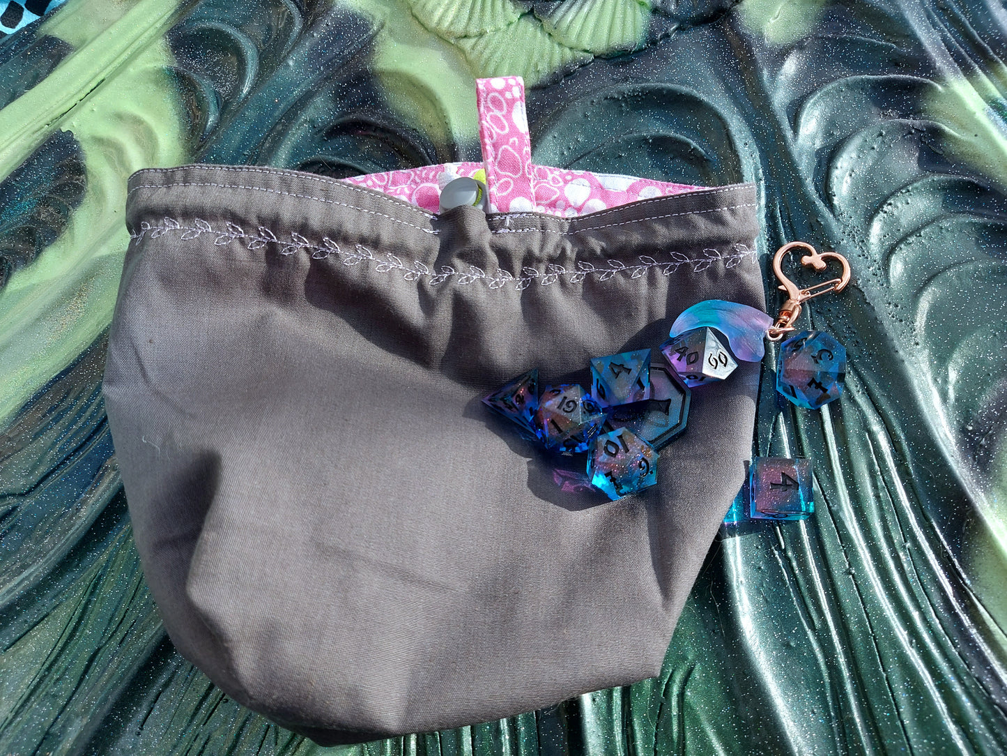 These dice bags are made of cotton and feature embroidery on the drawstring channel. There is a loop for clipping keychains to or clipping it to something for easy transport. They can hold approximately 200 dice(give or take) which is a little more than 28 traditional polyhedral sets.