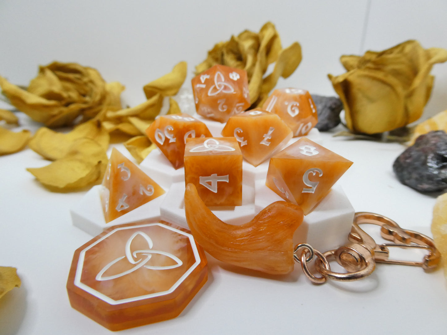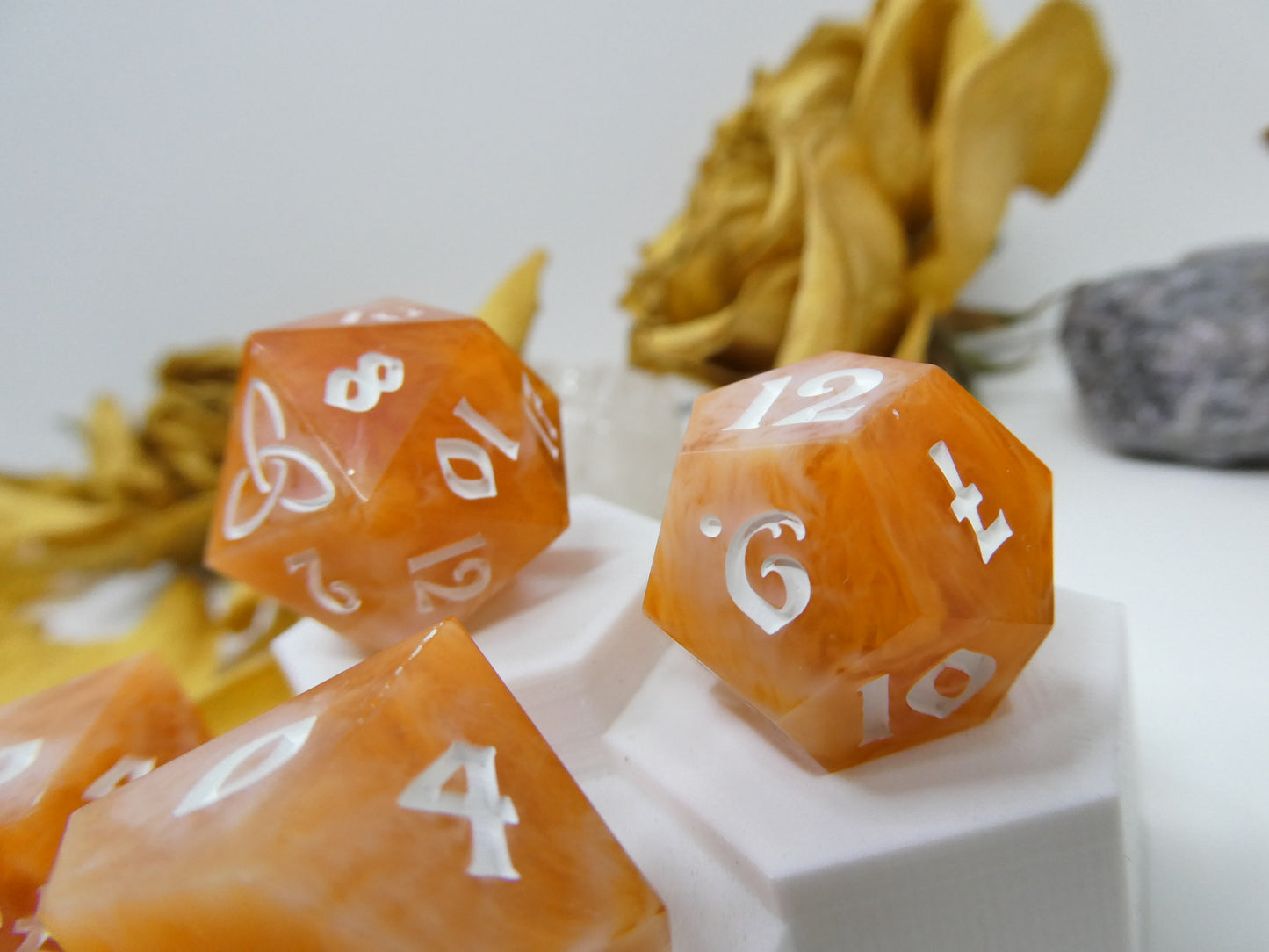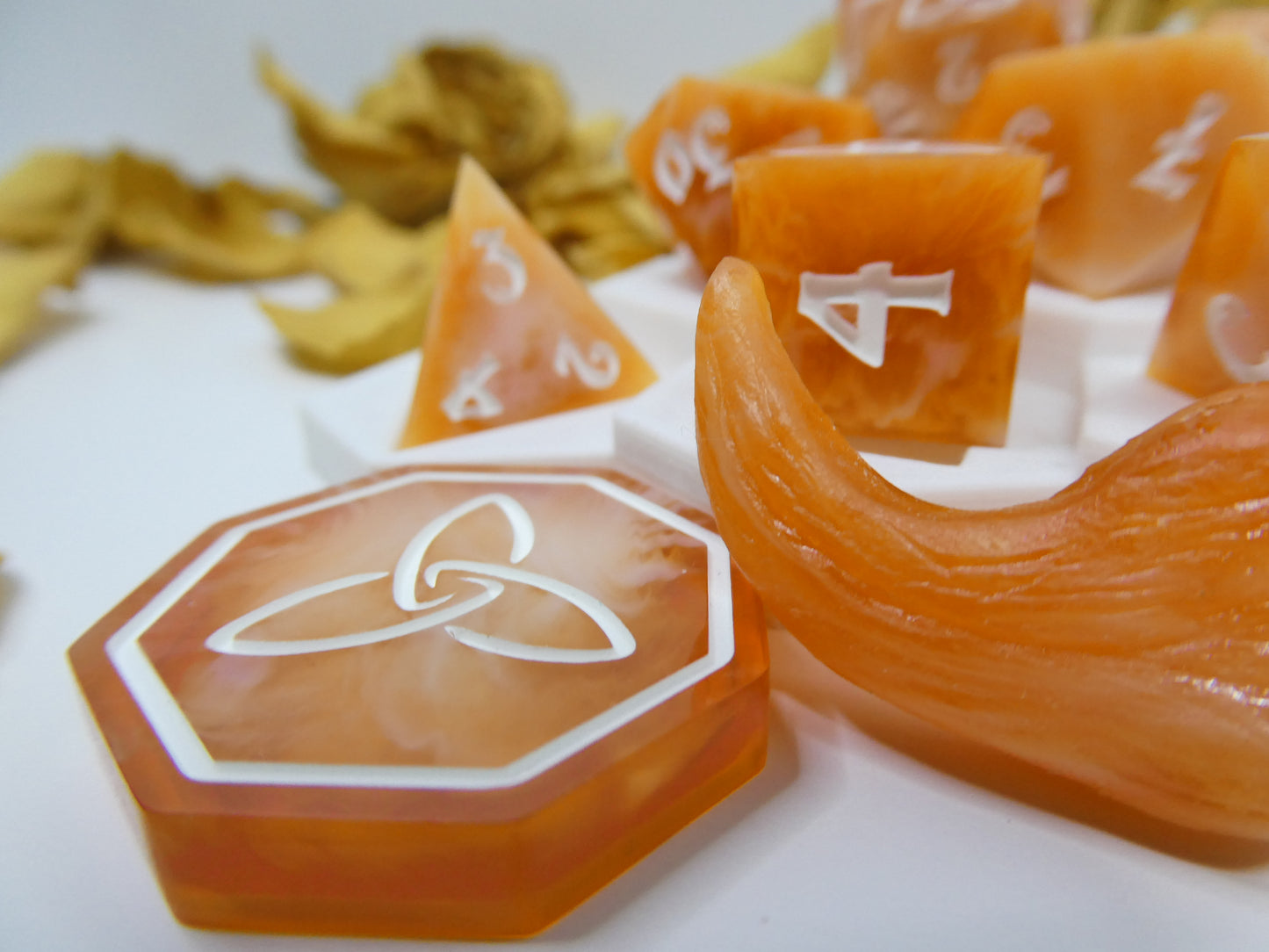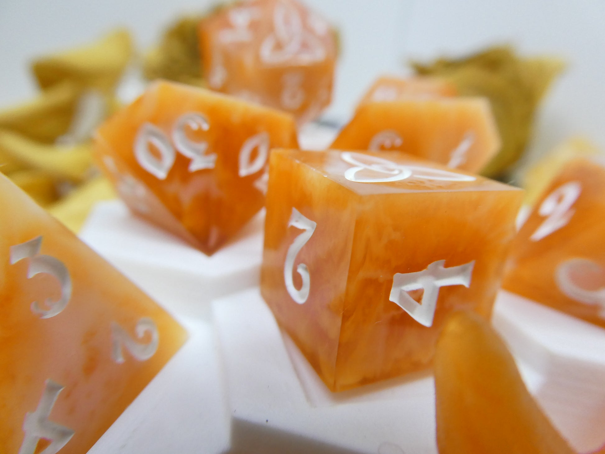 Thai tea is a marbled set made to match the colors of a fresh glass of iced Thai tea with half and half mixing in. The numbers are inked white.