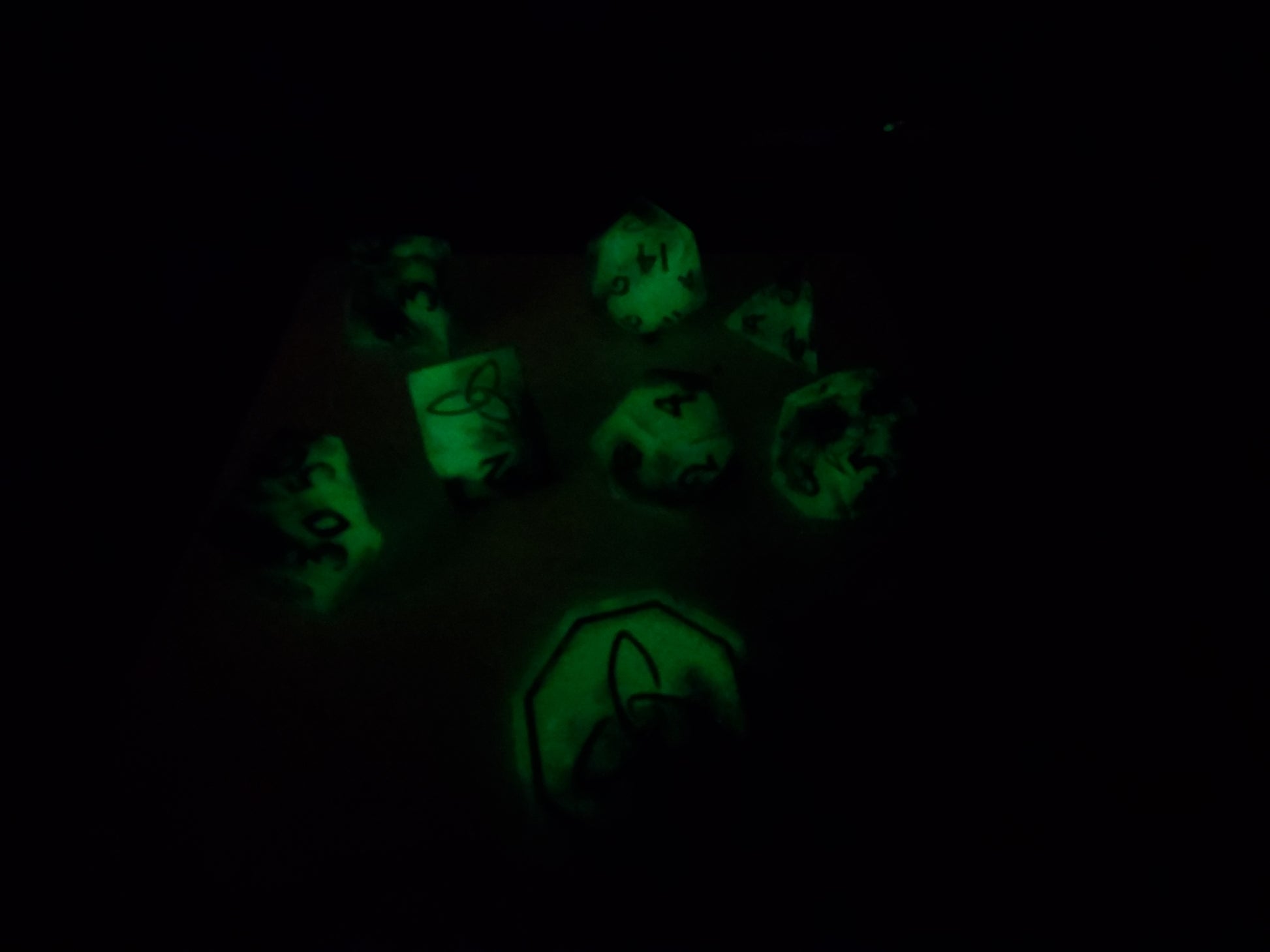 Thalassophobia features tendrils of the depths reaching up with a hidden layer of shimmer, floating glitter seaweed, and glow-in-the-dark green for an unsettling appearance at night.