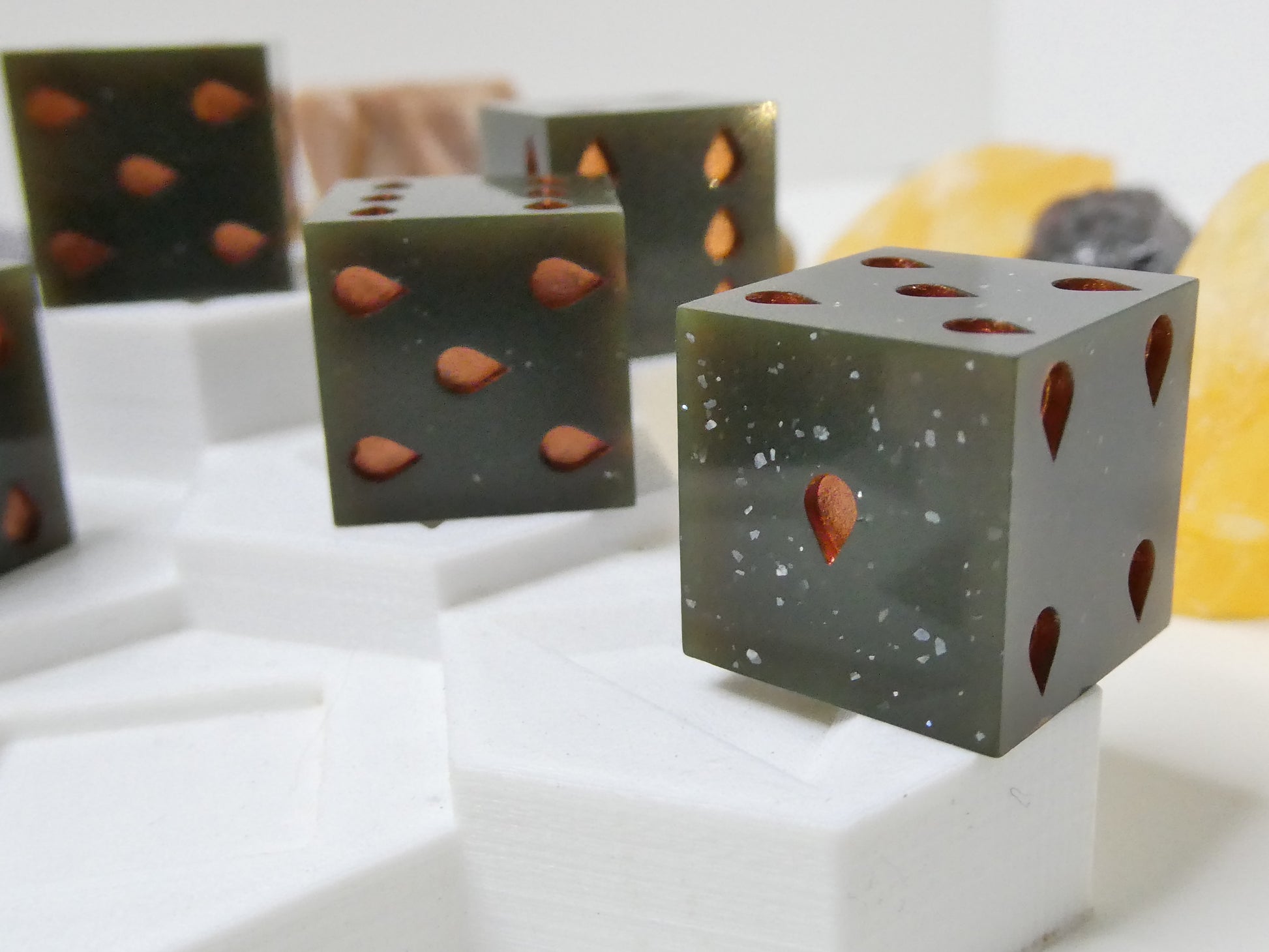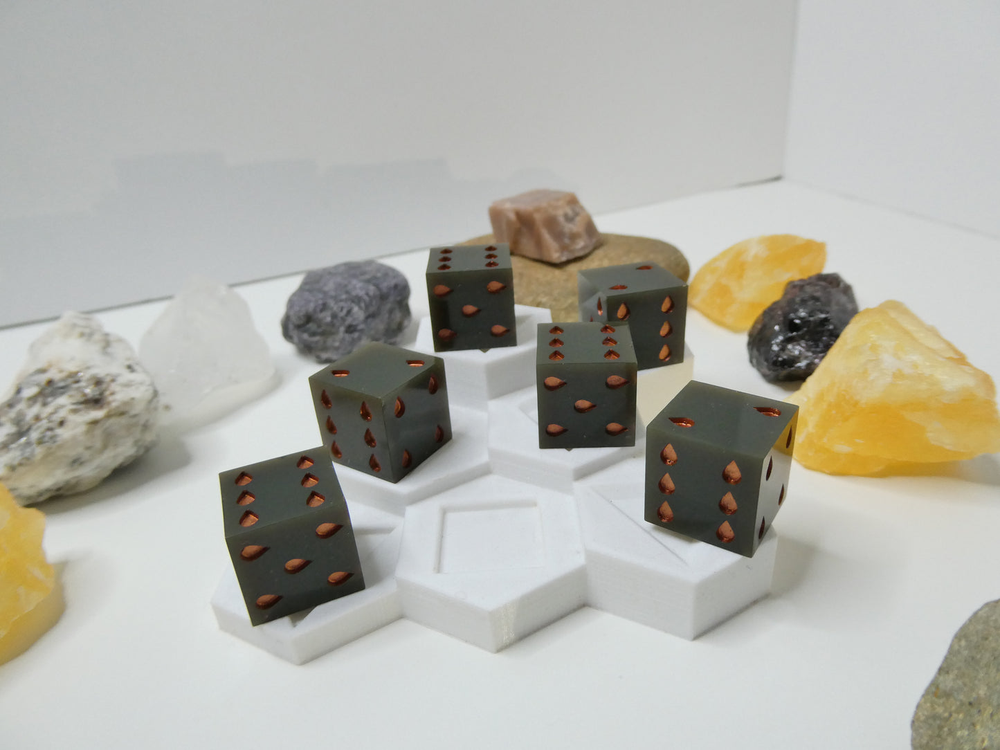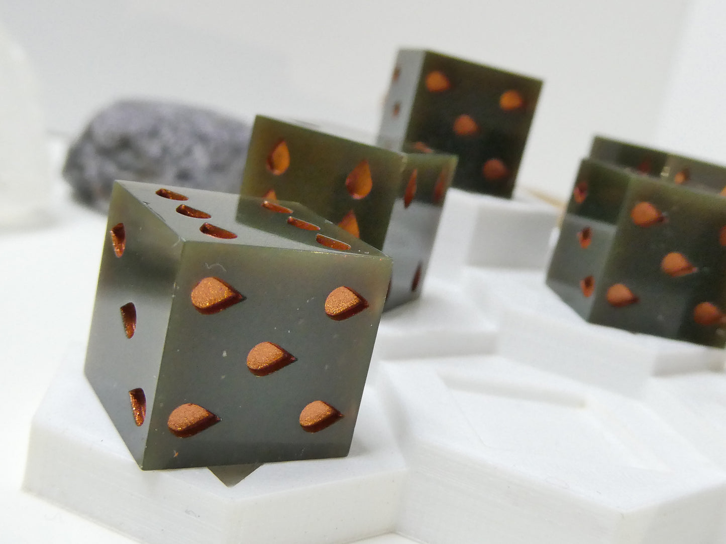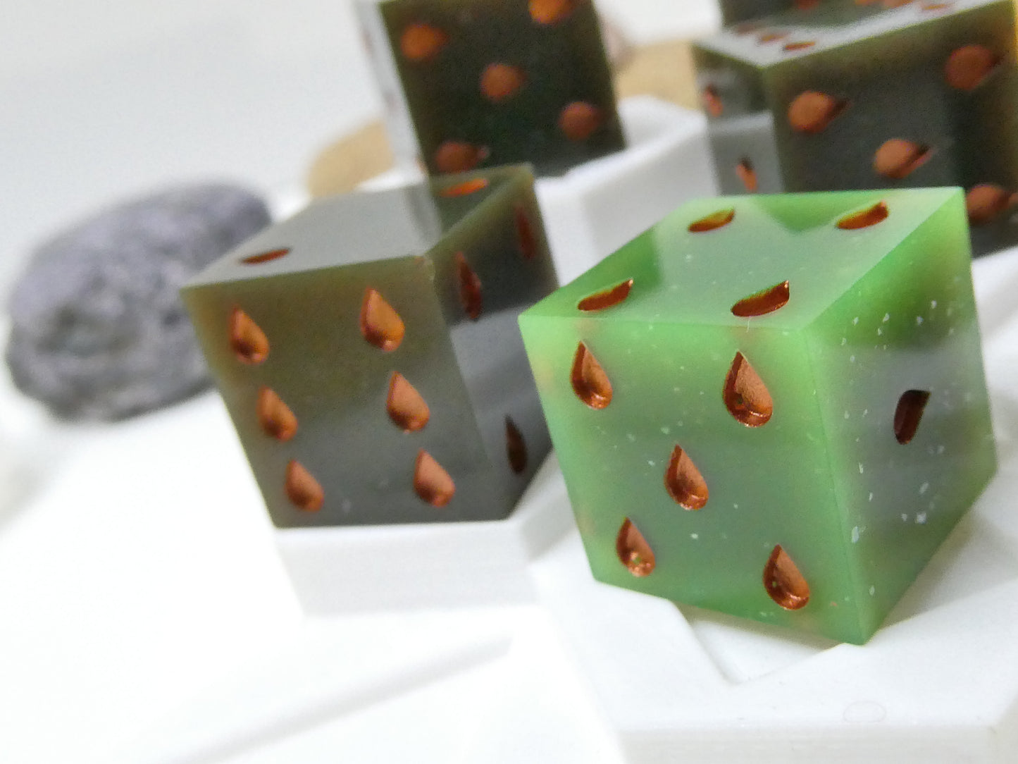 This set is entirely thermochromatic in nature- appearing as an extremely dark brown that shifts to bright green when warmed up. It has a faint shimmer when held to the light.