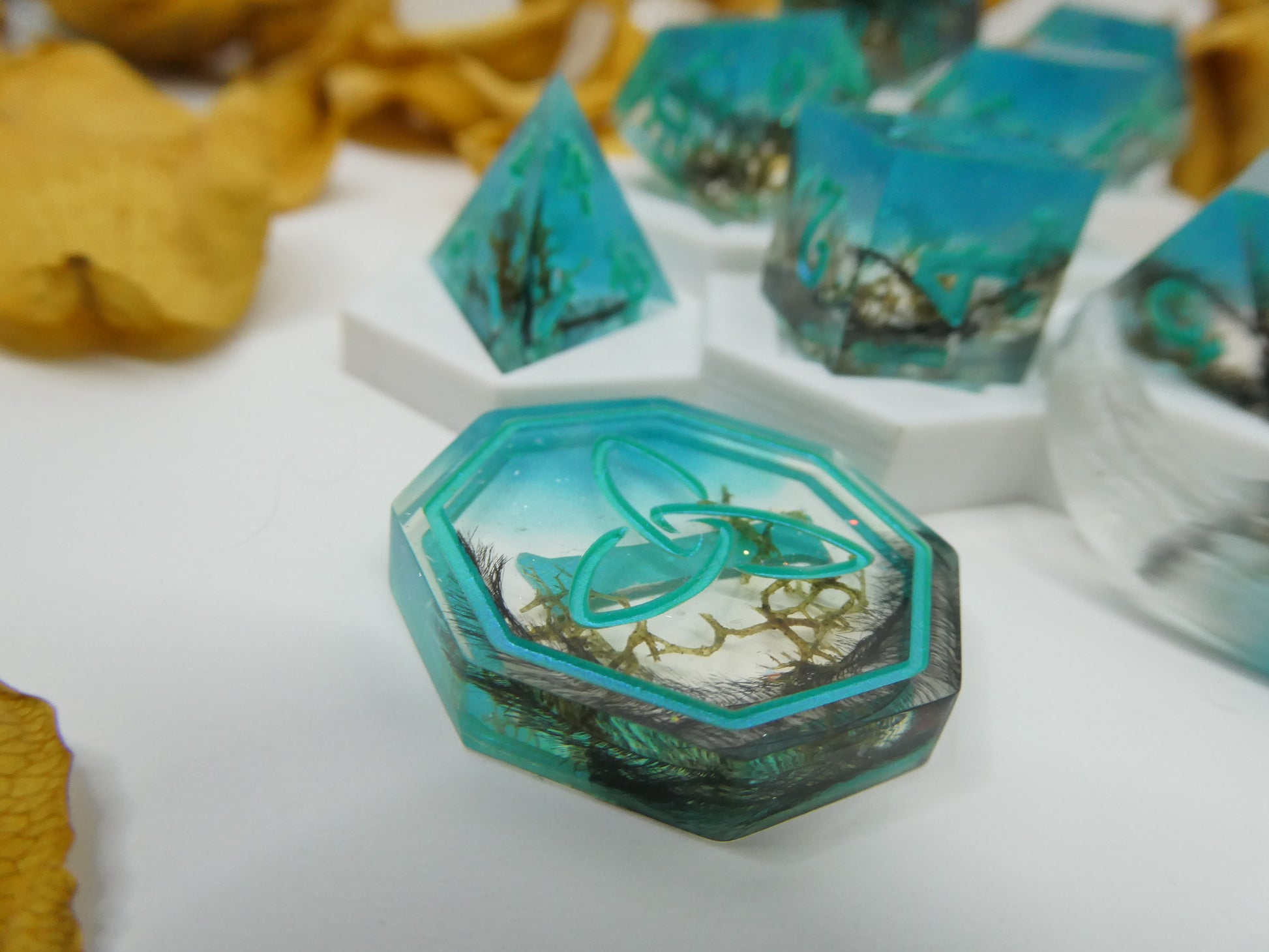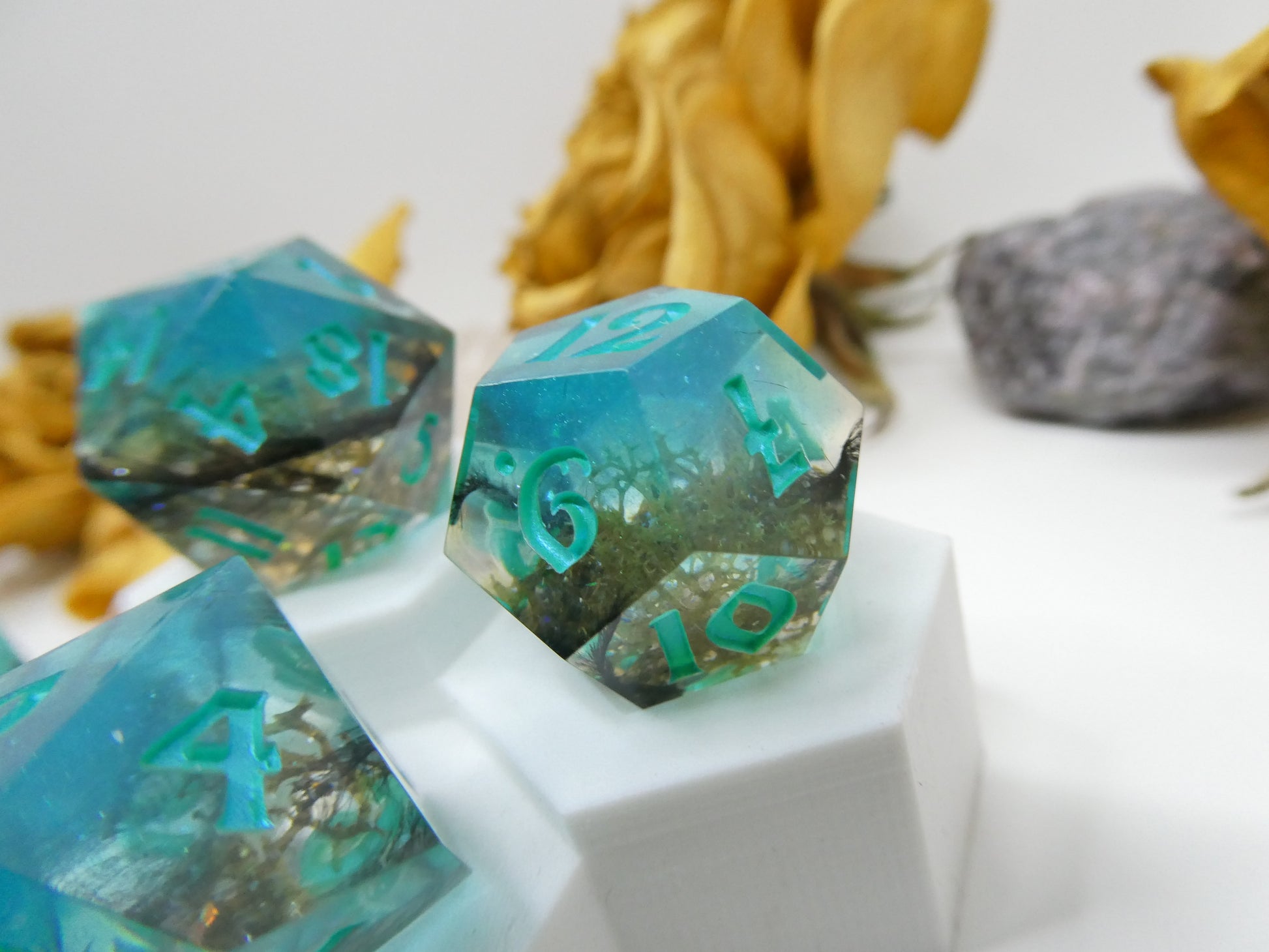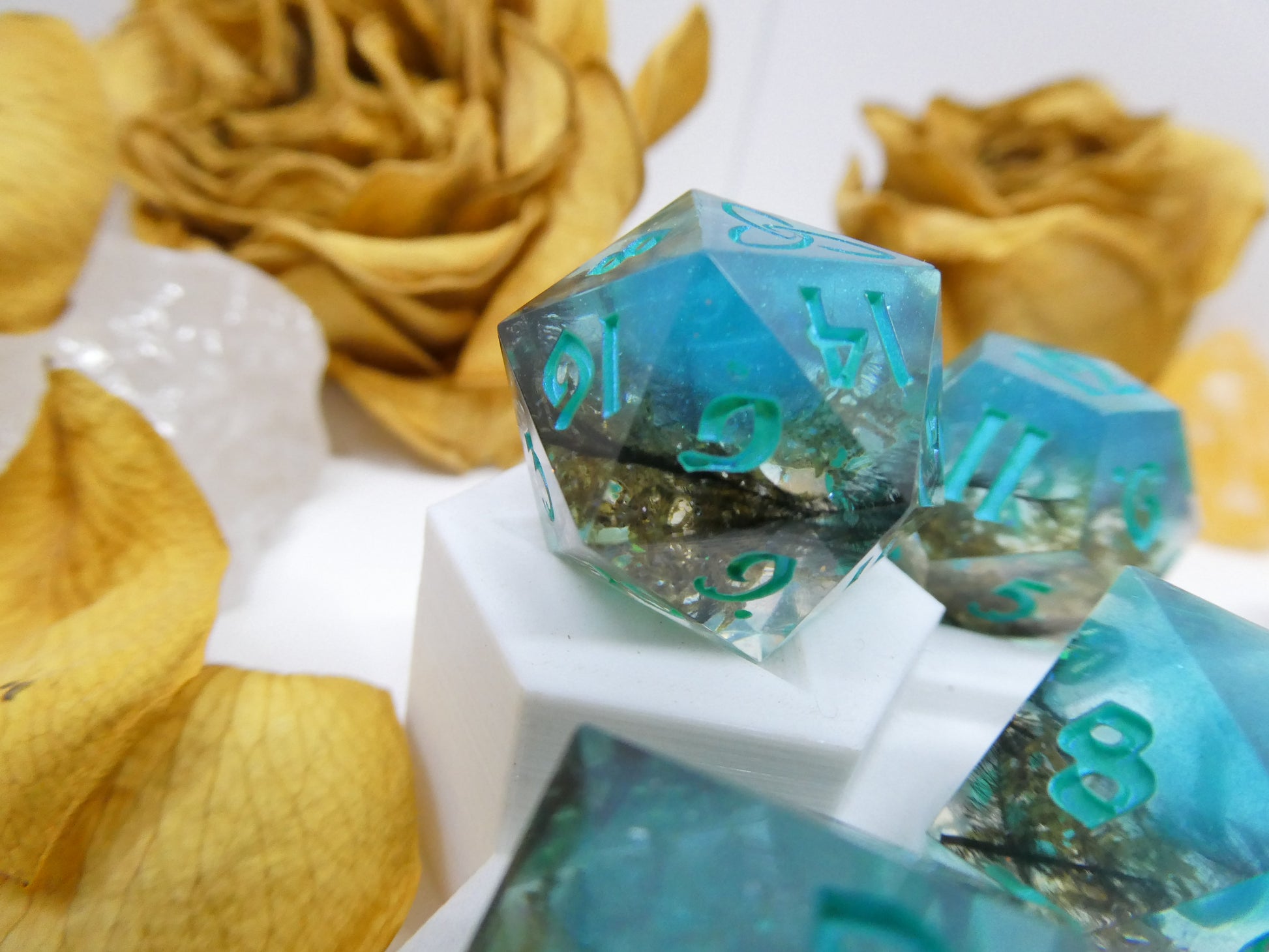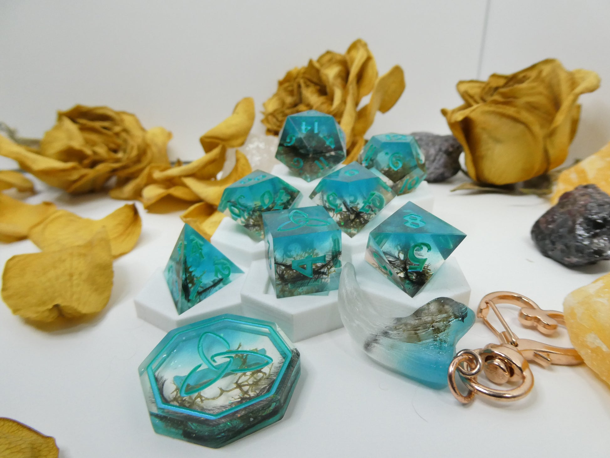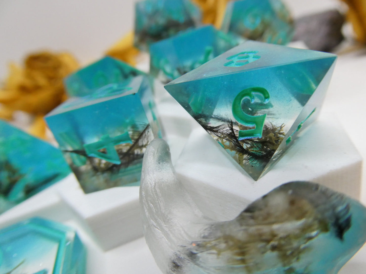 Unplanned Flight features small black feathers and moss nestled underneath a haze of sky blue. They're inked in a color-shift aqua.